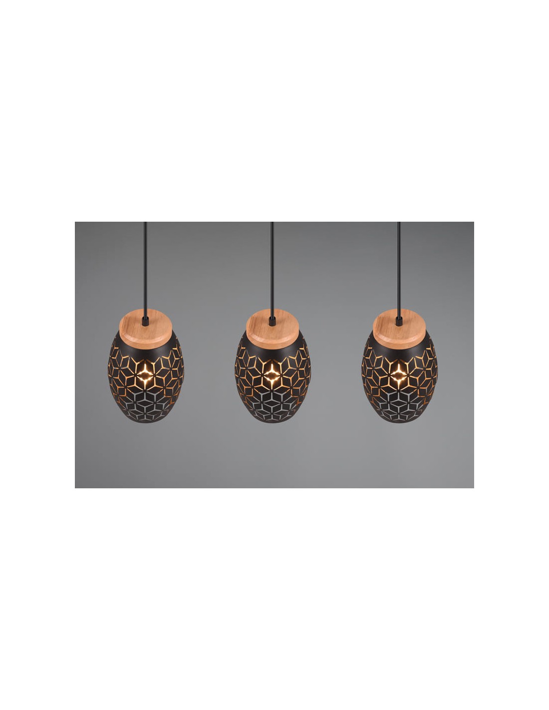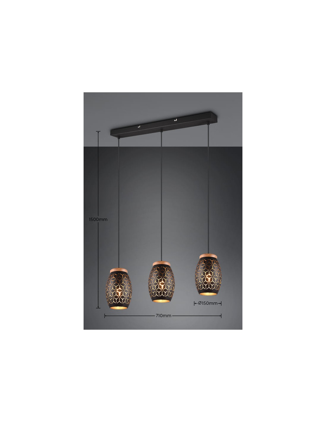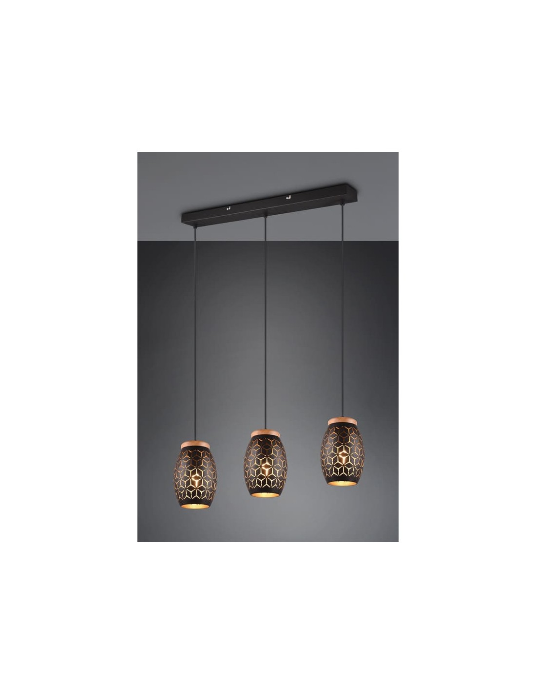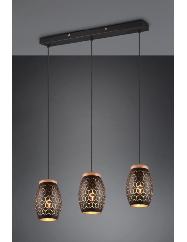 La suspension Bidar noir et or de TRIO est un luminaire à trois ampoules E27, conçu en métal avec une finition noir mat associée à des touches dorées et un accent en bois.