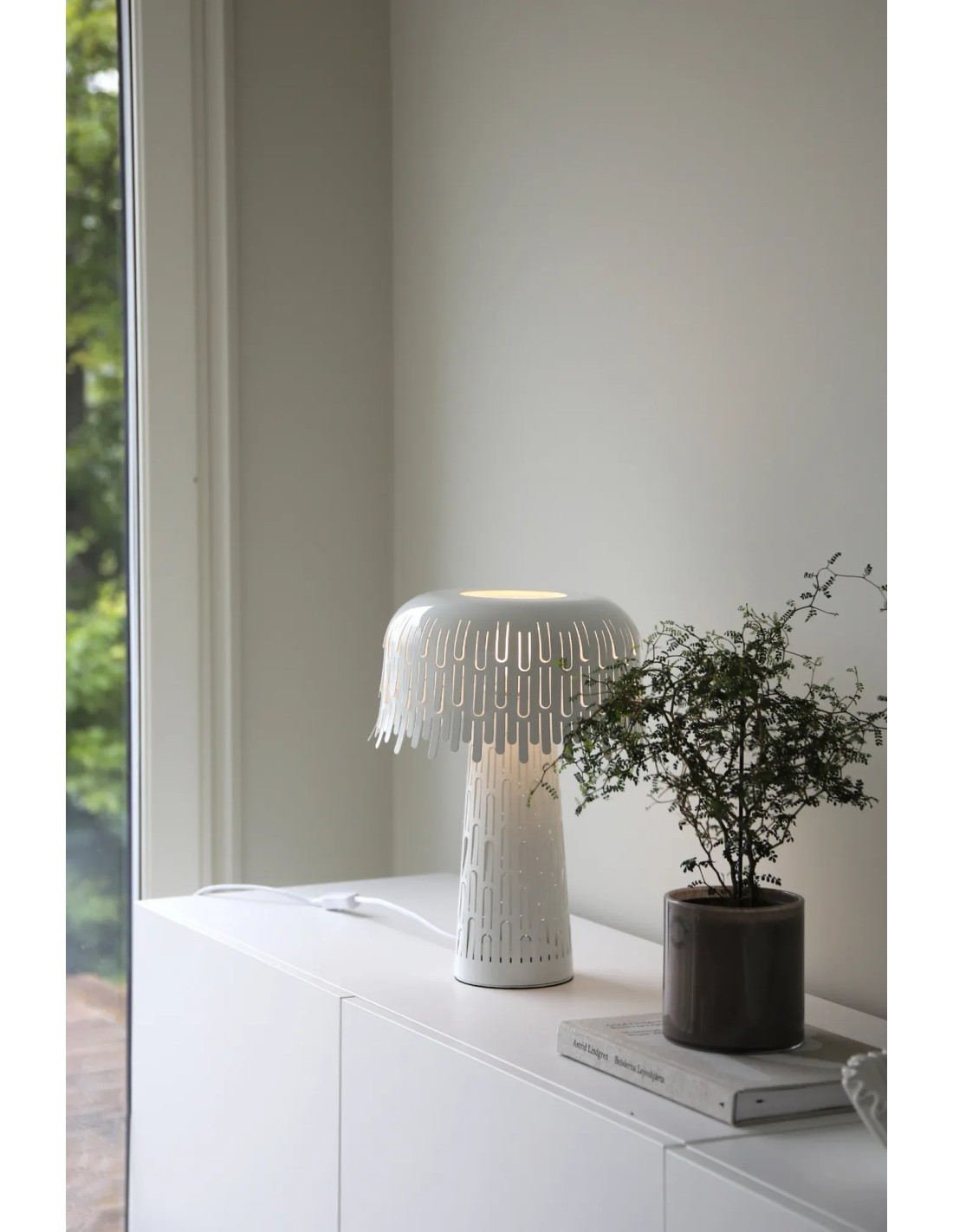 Ses découpes décoratives projettent une lumière douce et graphique, idéale pour créer une ambiance chaleureuse et élégante. Sa finition blanche brillante renforce la luminosité et s’intègre parfaitement dans tous types d’intérieurs, du plus contemporain au plus épuré.