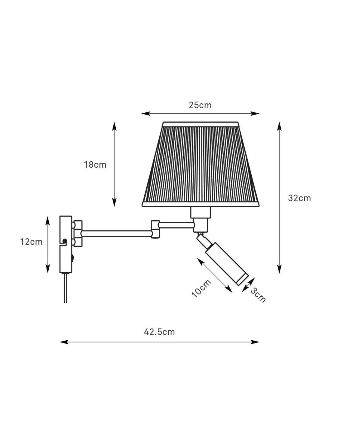 Elle dispose d’un bras articulé avec abat-jour en tissu blanc cassé pour un éclairage d’ambiance, ainsi qu’une lampe de lecture orientable avec LED intégrée de 4W, idéale pour un éclairage ciblé.