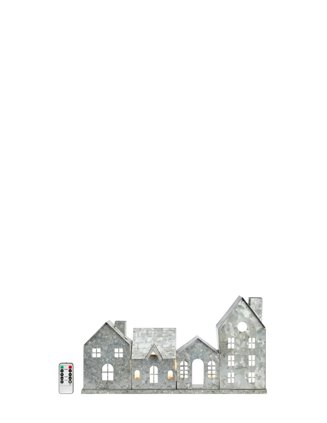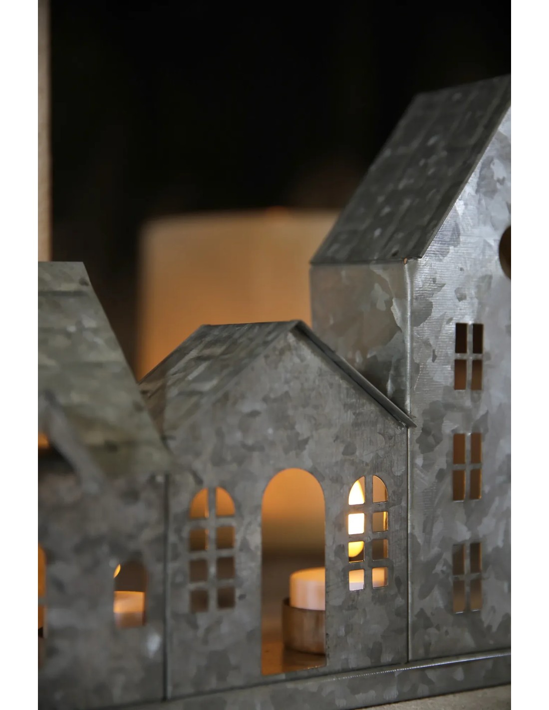 La décoration de table Wells de la marque Markslojd est conçue en fer finition zinc antique, avec un design en forme de façade de maison à la fois décoratif et fonctionnel.