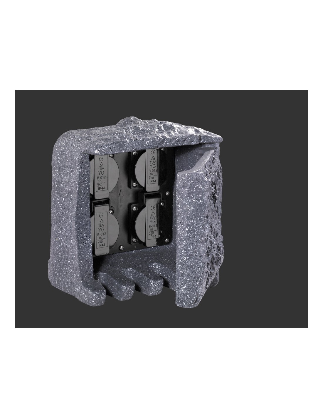 Fabriquée en polyrésine grise, cette prise de jardin est conçue pour résister aux éclaboussures d'eau avec son indice de protection IP44, ce qui la rend idéale pour un usage en extérieur.