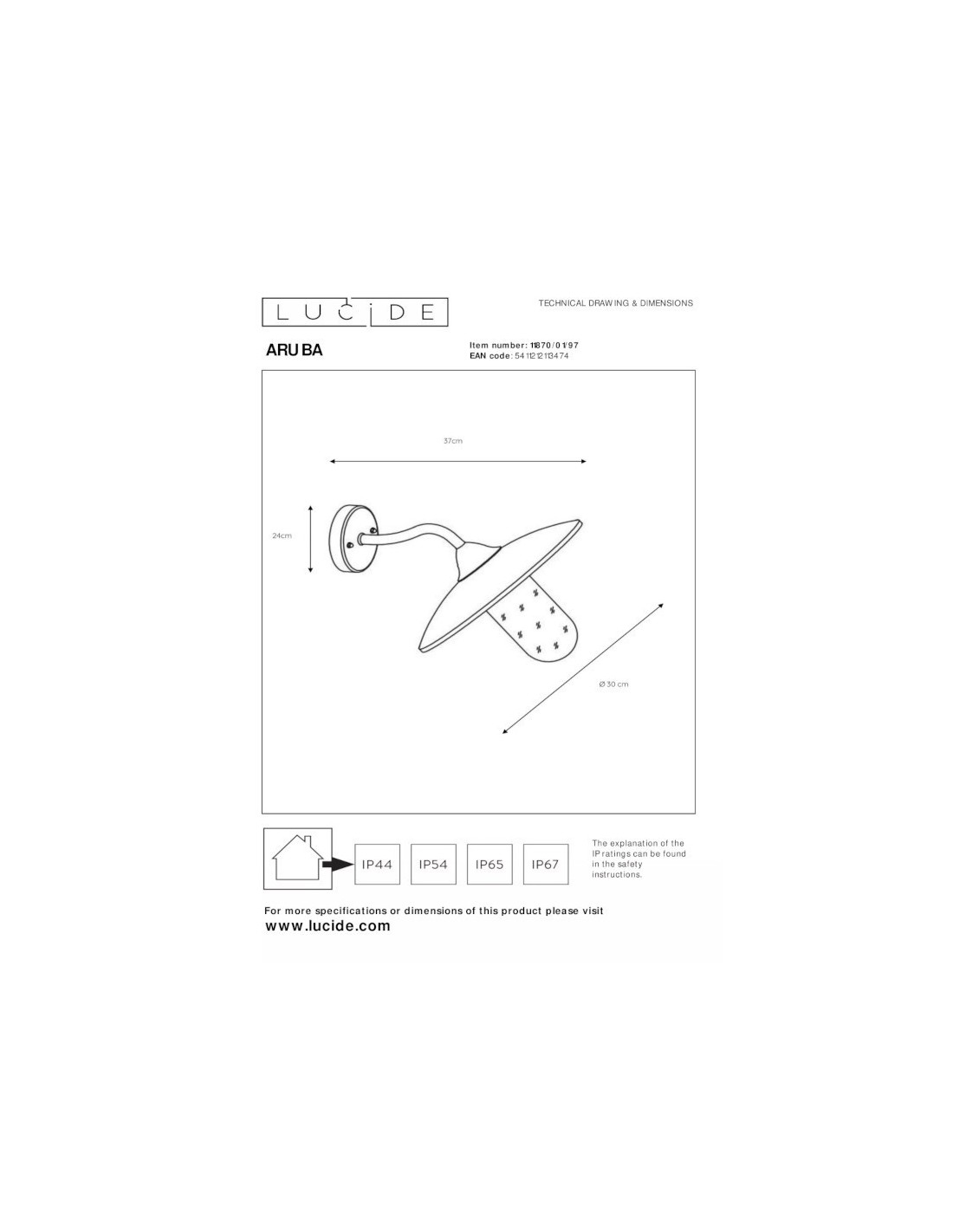 L'applique Aruba fonctionne avec 1 ampoule E27 40 W maximum, non fournie, ce qui vous permet de choisir selon vos goûts intensité lumineuse et température de couleur.