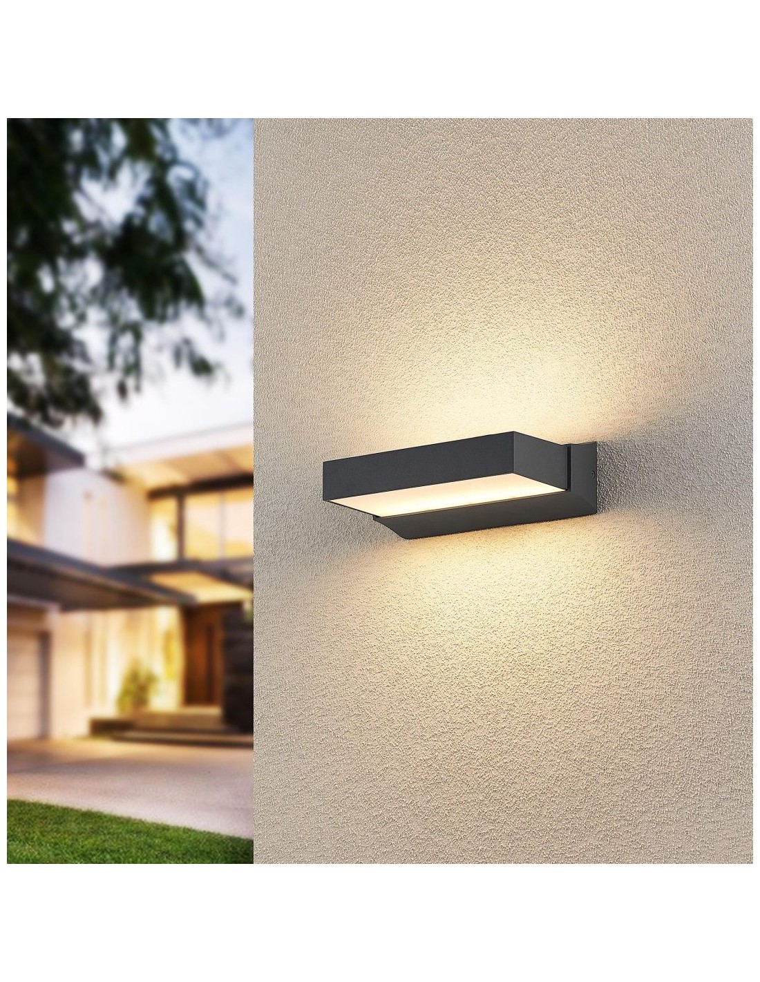 L’applique CUANDO diffuse la lumière vers le haut et vers le bas, créant un effet lumineux graphique et moderne sur vos murs extérieurs. Son coloris anthracite sobre et élégant s’intègre facilement à toutes les façades.