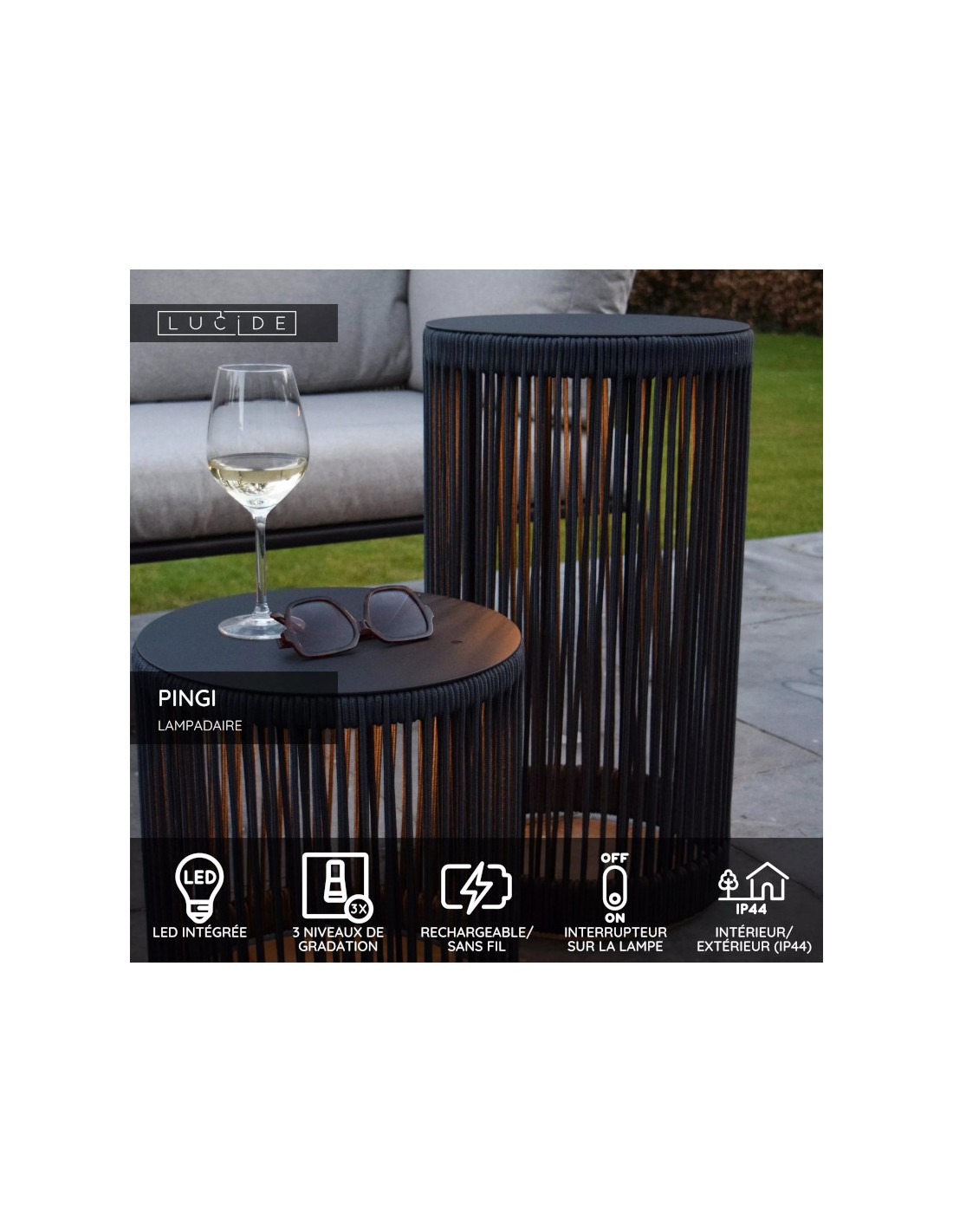 Ce lampadaire extérieur Pingi fonctionne sur batterie rechargeable et est dimmable en 3 étapes.