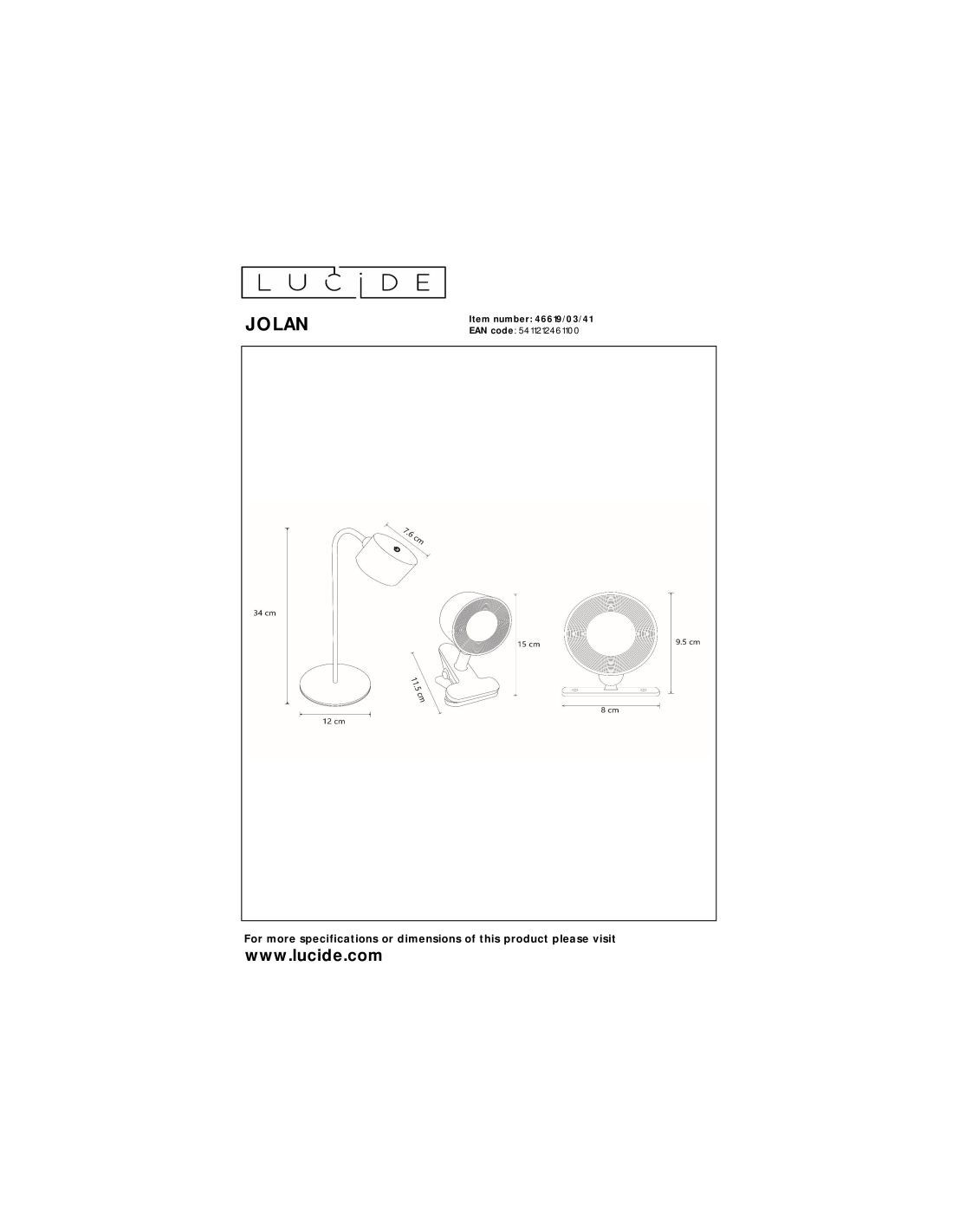 Dimensions : Plaque murale haut. 8 cm - pied de lampe haut 36cm prof 12 cm - pince prof 11,5 cm haut 15 cm - source lumineuse diam. 7,6 cm Poids : 0.4 kg