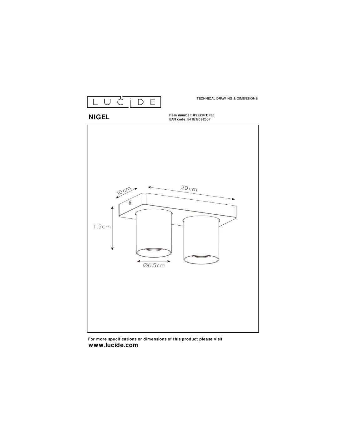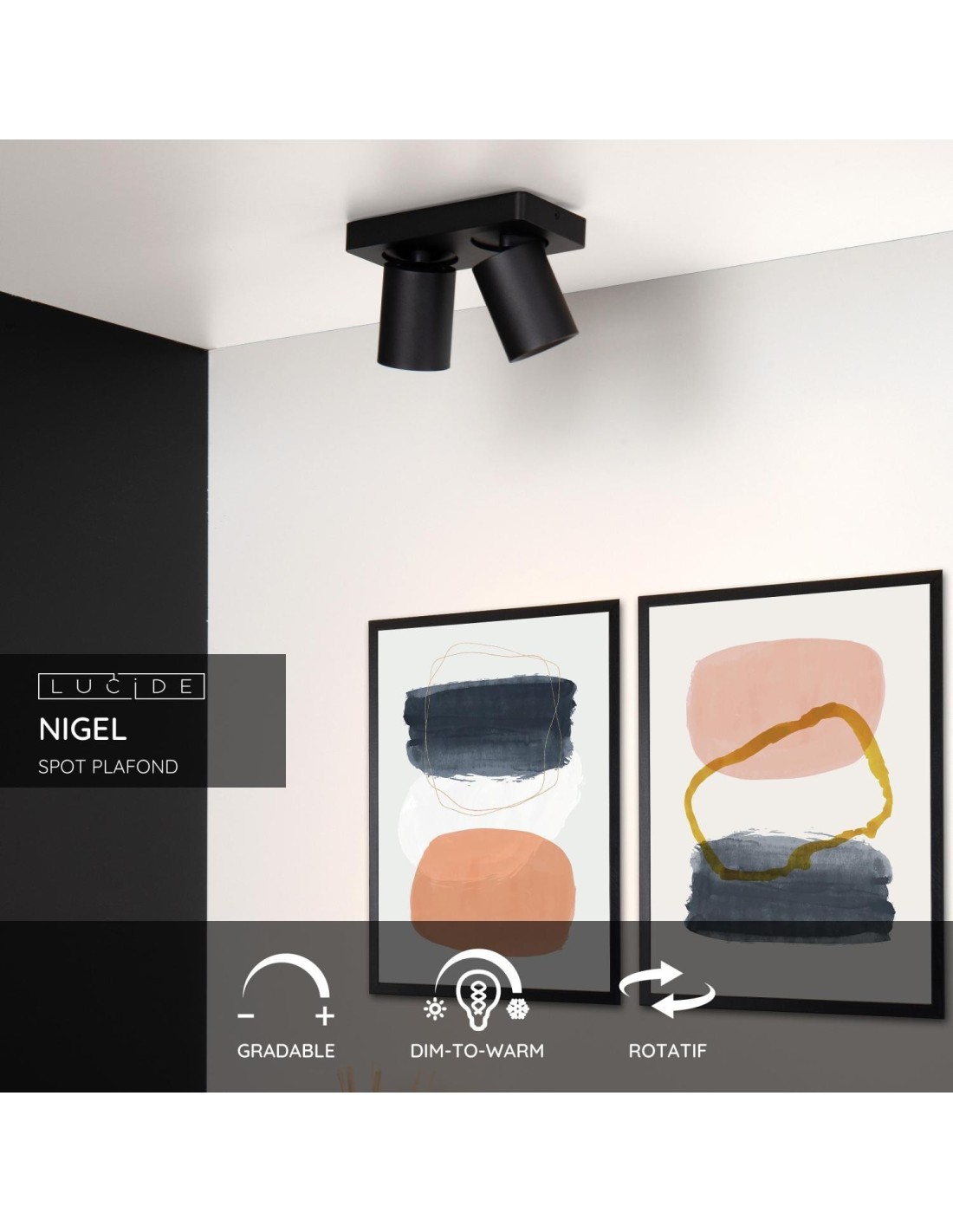 Voici Nigel, un spot plafond compatible avec deux sources lumineuses LED GU10 dim to warm. Ceux-ci émettent une lumière de 2200 à 3000k. Une conception simple et intemporelle munie d'un abat-jour cylindrique pour que le spot se sente à sa place dans toute une variété de styles d'intérieur. Nigel est disponible en noir et en blanc. Et avec plusieurs points lumineux. La version blanche a reçu un accent noir, à l'intérieur du luminaire. Le spot plafond en aluminium mesure 12 centimètres. Fixez Nigel au plafond, équipez-le d'un variateur compatible, dirigez et inclinez le spot comme vous le voulez et profitez de sa lumière.