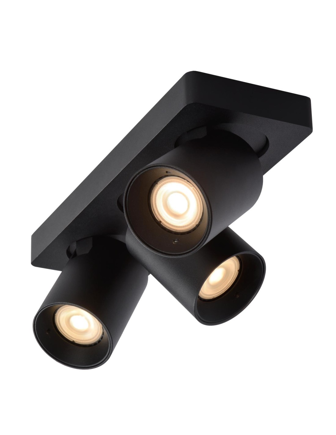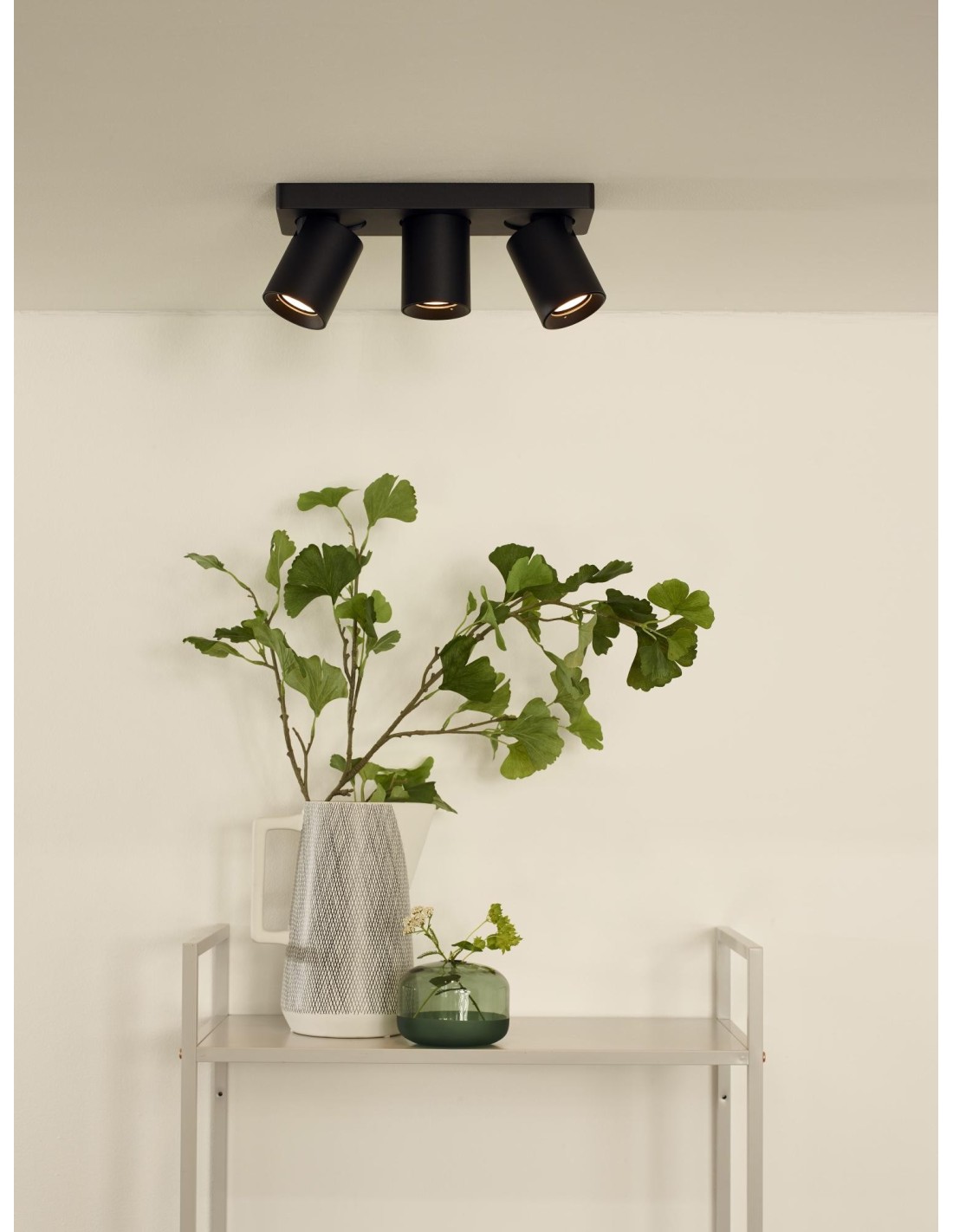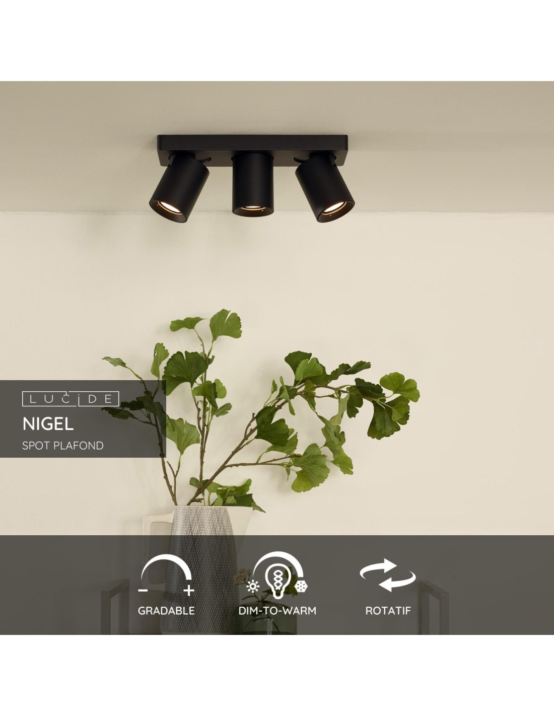 Voici Nigel, un spot plafond compatible avec trois sources lumineuses LED GU10 dim to warm. Ceux-ci émettent une lumière de 2200 à 3000k. Une conception simple et intemporelle munie d'un abat-jour cylindrique pour que le spot se sente à sa place dans toute une variété de styles d'intérieur. Nigel est disponible en noir et en blanc. Et avec plusieurs points lumineux. L'intérieur de la version blanche du luminaire est noir. Le spot plafond en aluminium mesure 12 centimètres. Fixez Nigel au plafond, équipez-le d'un variateur compatible, dirigez et inclinez le spot comme vous le voulez et profitez de sa lumière.