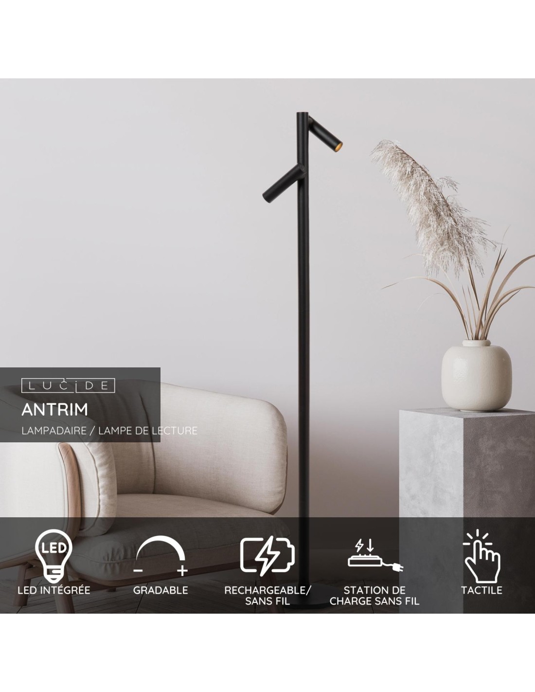 Installez-vous confortablement, prenez un bon livre et allumez votre lampe de lecture Antrim. Ce lampadaire au design subtil se distingue par son efficacité. Vous orientez la lampe de lecture grâce à la source lumineuse inclinable et vous tamisez facilement la lumière grâce à un capteur tactile. De plus, vous rechargez la lampe de lecture rapidement et facilement grâce au câble USB fourni. En y regardant de plus près, vous remarquerez également à la lumière la finition luxueuse qui diffuse une lueur chaleureuse. La lampe Antrim livre ses secrets aux passionnés de lecture, vous voilà prévenus.