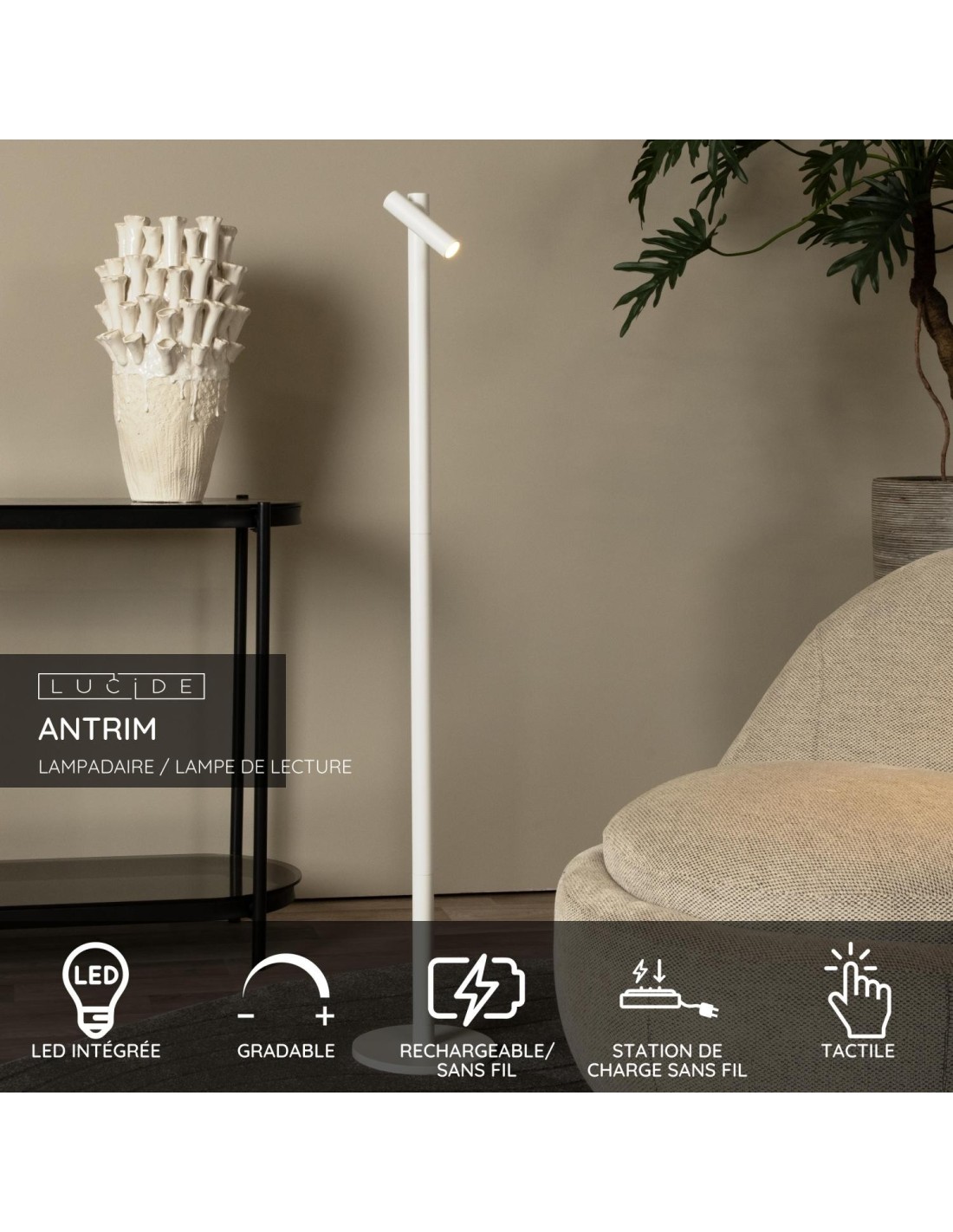 Installez-vous confortablement, prenez un bon livre et allumez votre lampe de lecture Antrim. Ce lampadaire au design subtil se distingue par son efficacité. Vous orientez la lampe de lecture grâce à la source lumineuse inclinable et vous tamisez facilement la lumière grâce à un capteur tactile. De plus, vous rechargez la lampe de lecture rapidement et facilement grâce au câble USB fourni. En y regardant de plus près, vous remarquerez également à la lumière la finition luxueuse qui diffuse une lueur chaleureuse. La lampe Antrim livre ses secrets aux passionnés de lecture, vous voilà prévenus.