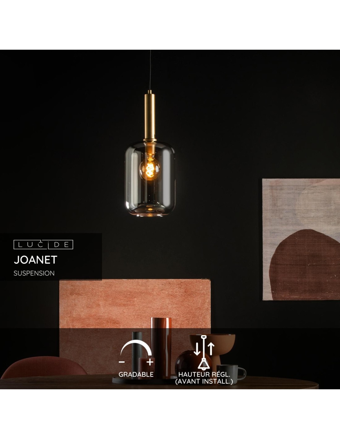Le verre et le laiton de haute qualité sont la formule idéale pour un design élégant. La suspension Joanet l'a bien compris. Les formes élégantes et la finition fumée du verre donnent à ce luminaire un côté mystérieux. Au coeur du tube de verre, l'ampoule diffuse une lueur agréable et diffuse. Il suffit d'ajuster la hauteur de Joanet avant de fixer la plaque de montage au plafond. Lorsqu'elle est connectée à un gradateur, cette lampe apportera encore plus d'ambiance dans votre intérieur moderne. Pour n'importe quelle occasion.