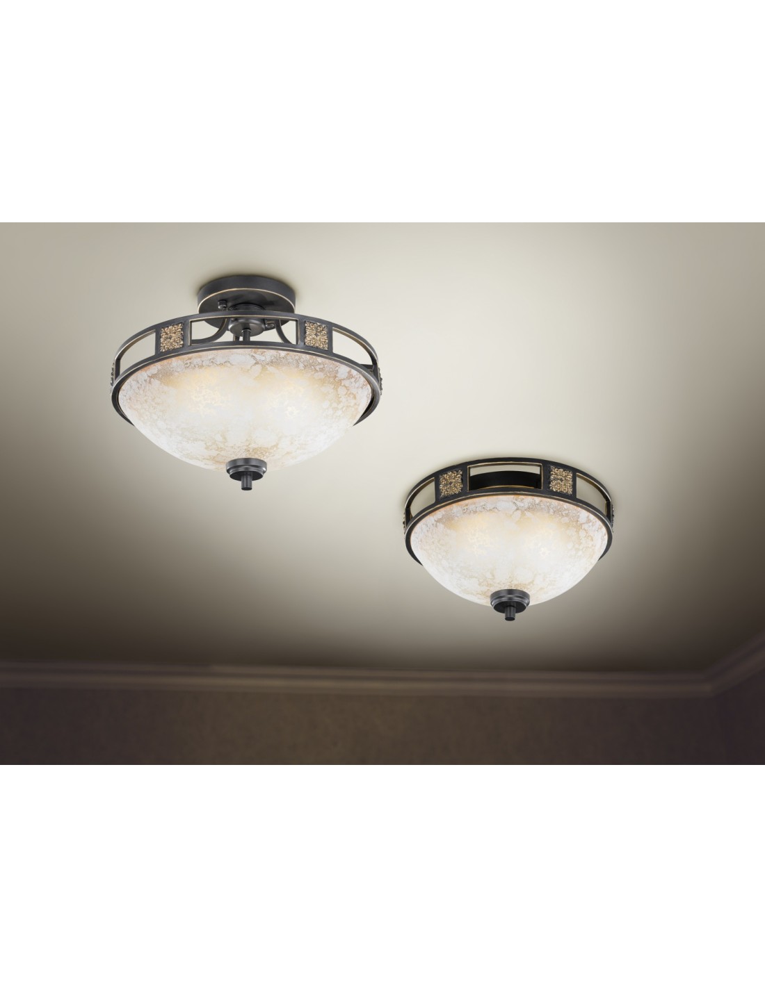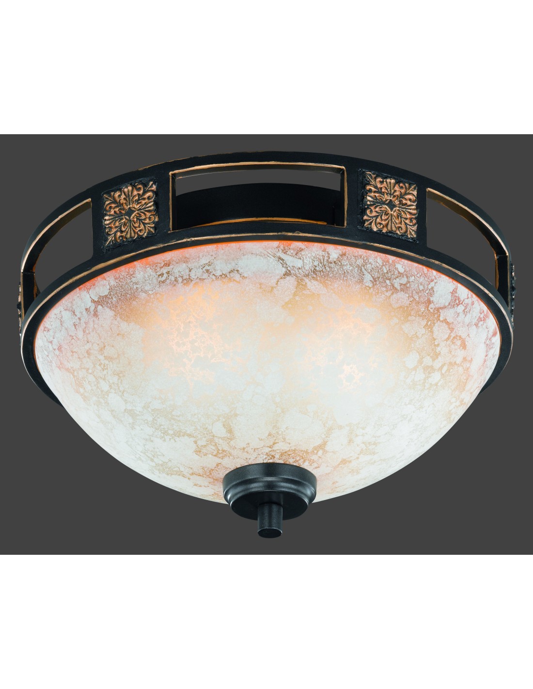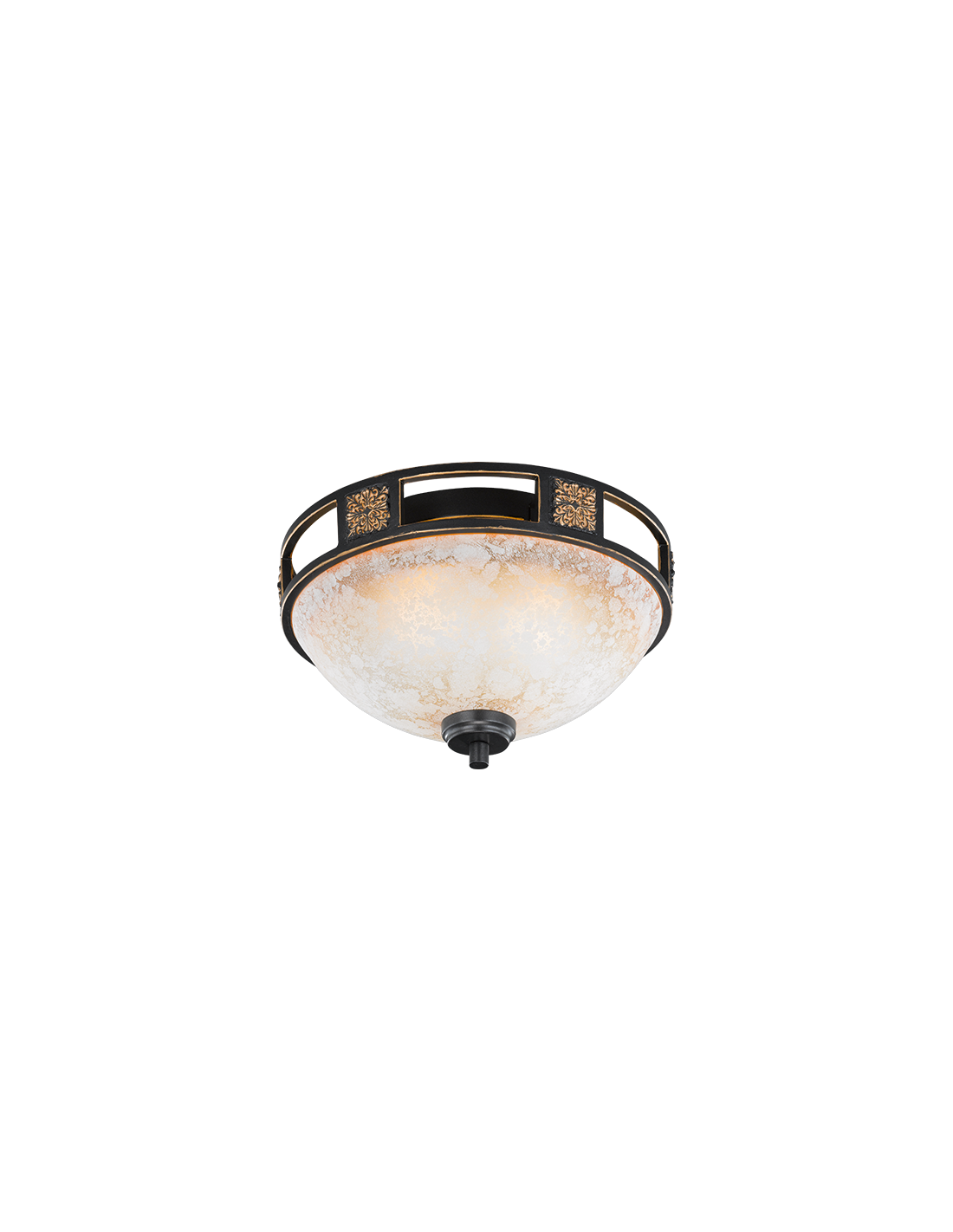 Le plafonnier Quinta de Trio séduit par son allure rustique aux accents méditerranéens. Il est composé d’un cadre en métal finition rouille, orné de détails dorés, et d’un diffuseur en verre de couleur albâtre légèrement texturé.