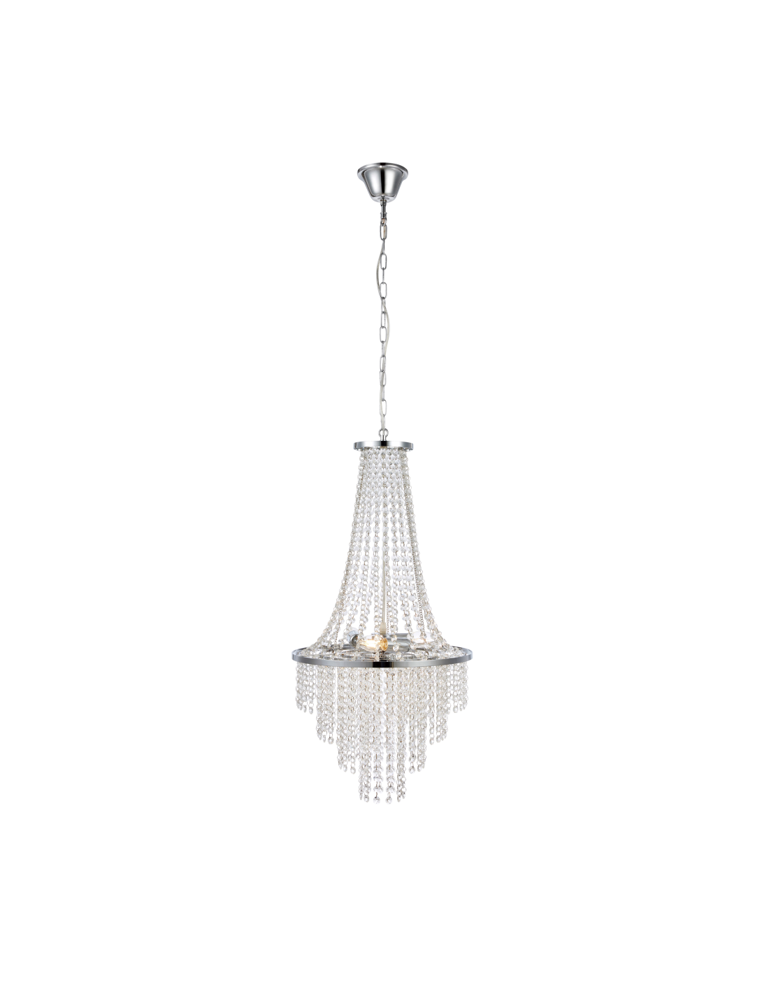 Sa structure en métal chromé est sublimée par des prismes en cristal clair, agencés en dégradés successifs afin de créer une mise en scène lumineuse spectaculaire.
