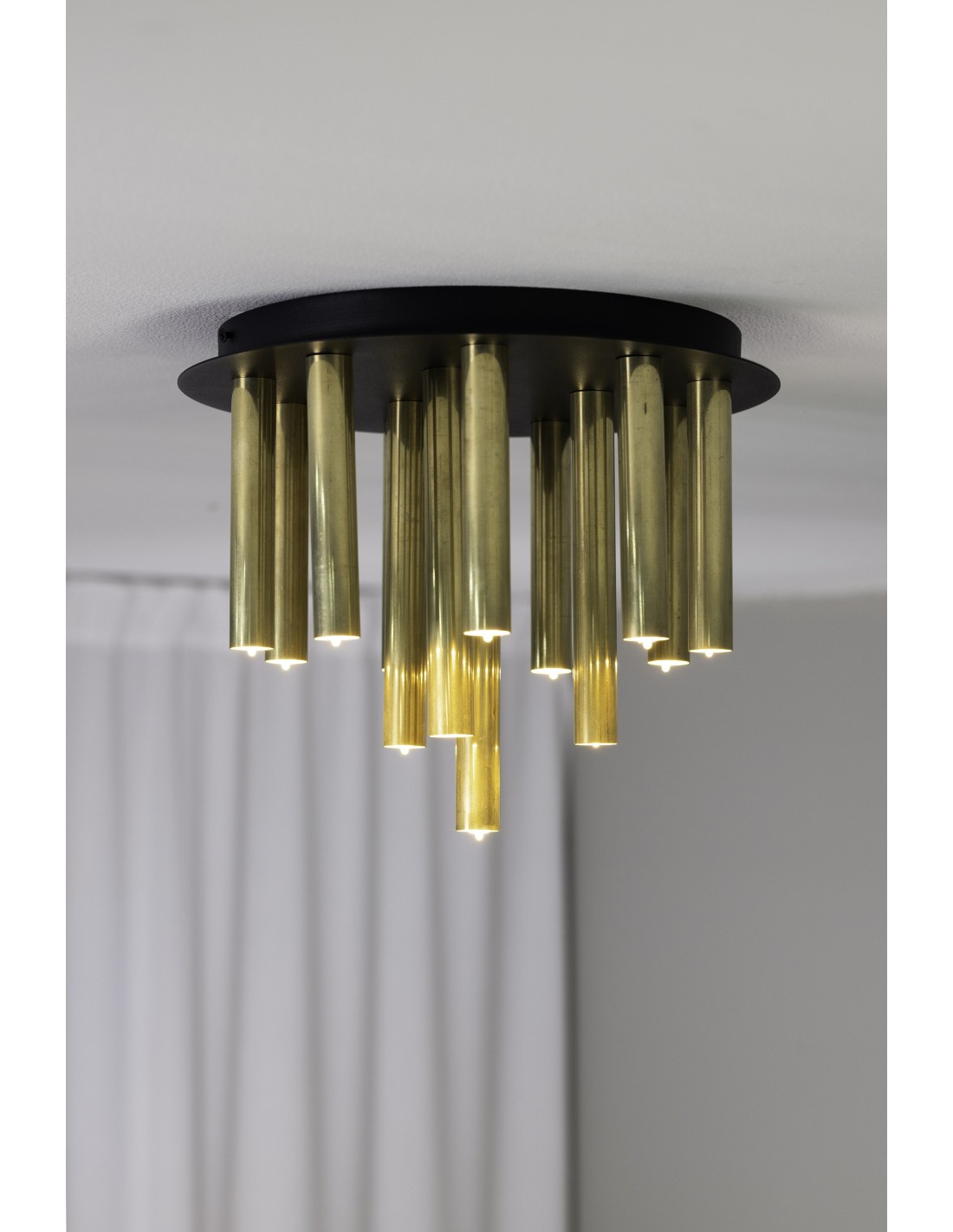 Le plafonnier Gocce de Markslöjd se distingue par ses 13 cylindres suspendus en laiton brut de différentes longueurs, fixés à une base en métal noir thermolaqué. Chaque cylindre abrite une ampoule G9 (non incluse), offrant un éclairage diffus et raffiné, idéal pour créer une atmosphère chaleureuse dans un salon, une salle à manger ou un hall d'entrée.