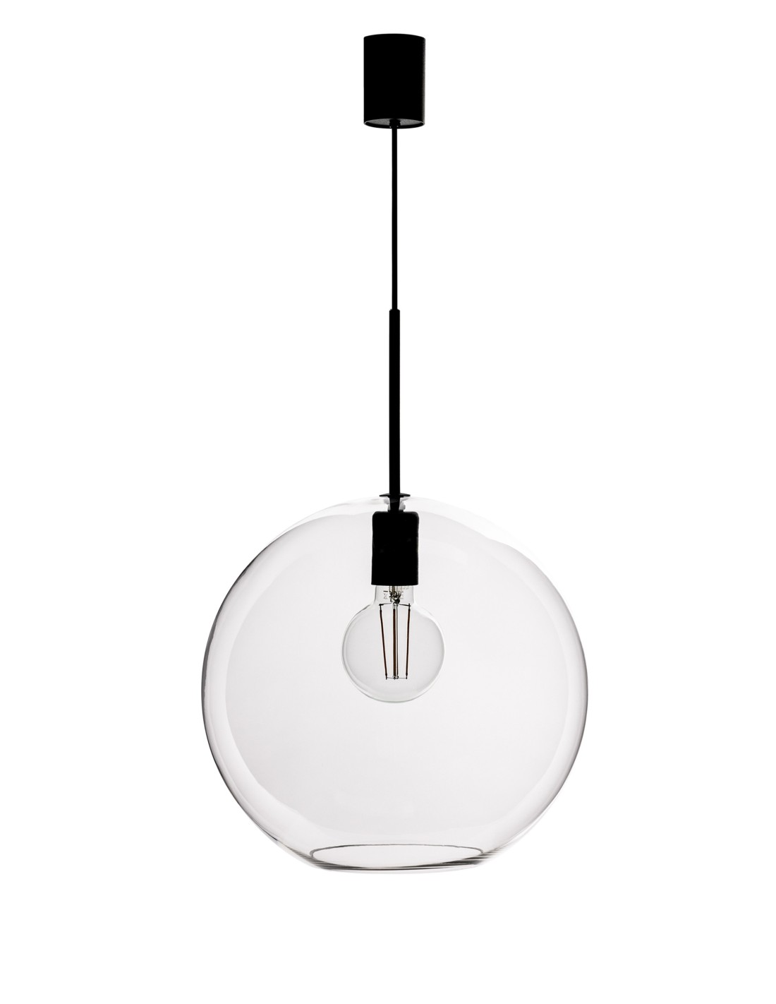 La suspension Patera de Markslöjd associe une base en métal noir à un abat-jour en verre transparent soufflé de 35 cm de diamètre.