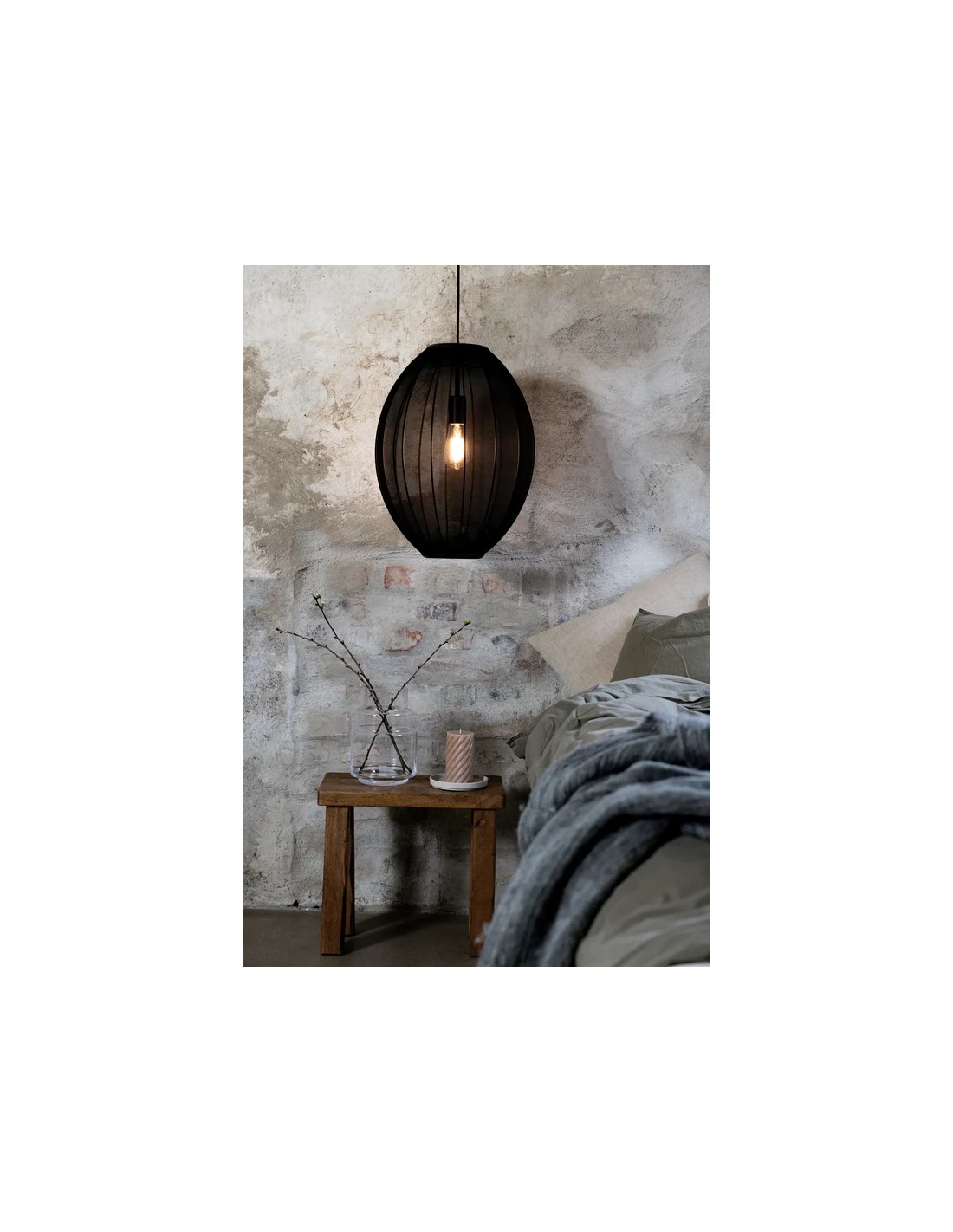 La Suspension Florence noire 40 cm de Markslöjd allie sobriété et raffinement grâce à son abat-jour en tissu noir et sa forme ovale. Elle offre un éclairage doux et diffus, idéal dans une chambre ou un coin lecture.