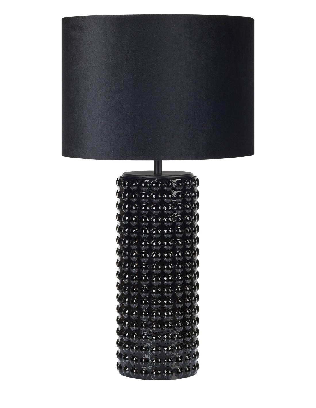 La lampe de table Proud de Markslöjd se distingue par sa base en verre bullé noire et son abat-jour en velours noir, combinant robustesse et élégance.