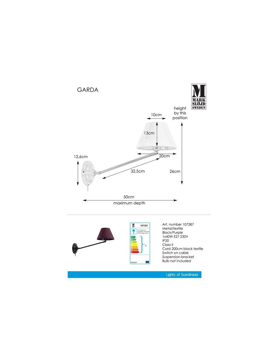 Les designers de Markslöjd ont pris le parti d'une esthétique sobre et élégante pour concevoir l'applique Garda, ce qui lui permet de s'intégrer à tout type de décoration intérieure. Le choix des couleurs correspond aux codes actuels : structure noir mat, abat-jour prune.