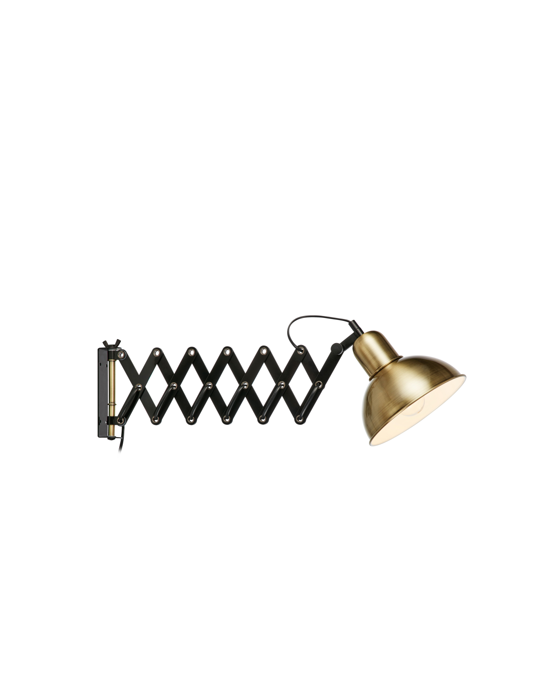 L'applique murale intérieure Riggs se présente sous la forme d'un bras "ciseaux" extensible et d'un abat-jour en métal équipé d'une douille E27.