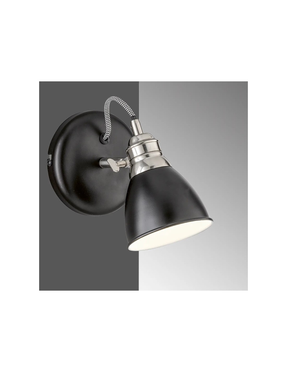 Vous apprécierez son design intemporel de style industriel et le contraste des couleurs et matières : métal laqué noir mat, chrome satiné, cordon textile bi-colore noir et blanc, intérieur du déflecteur blanc.