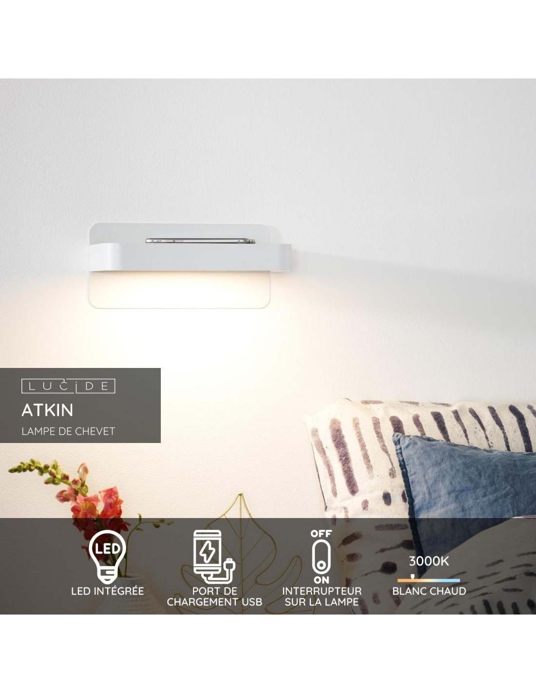 La lampe de chevet/ applique murale ATKIN de la marque Lucide est une solution d'éclairage moderne et fonctionnelle, idéale pour une chambre ou un espace nuit.