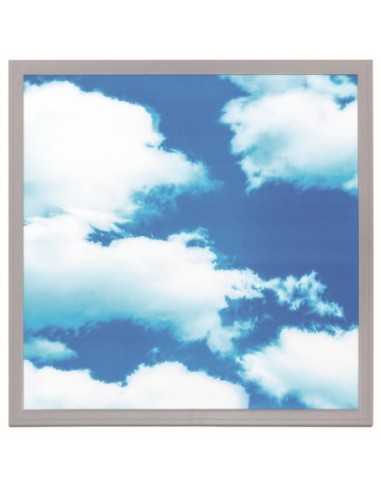 La dalle Led Ciel est en métal laqué et verre. Elle est composée d'un cadre blanc et d'un centre imprimé aspect ciel bleu nuageux.