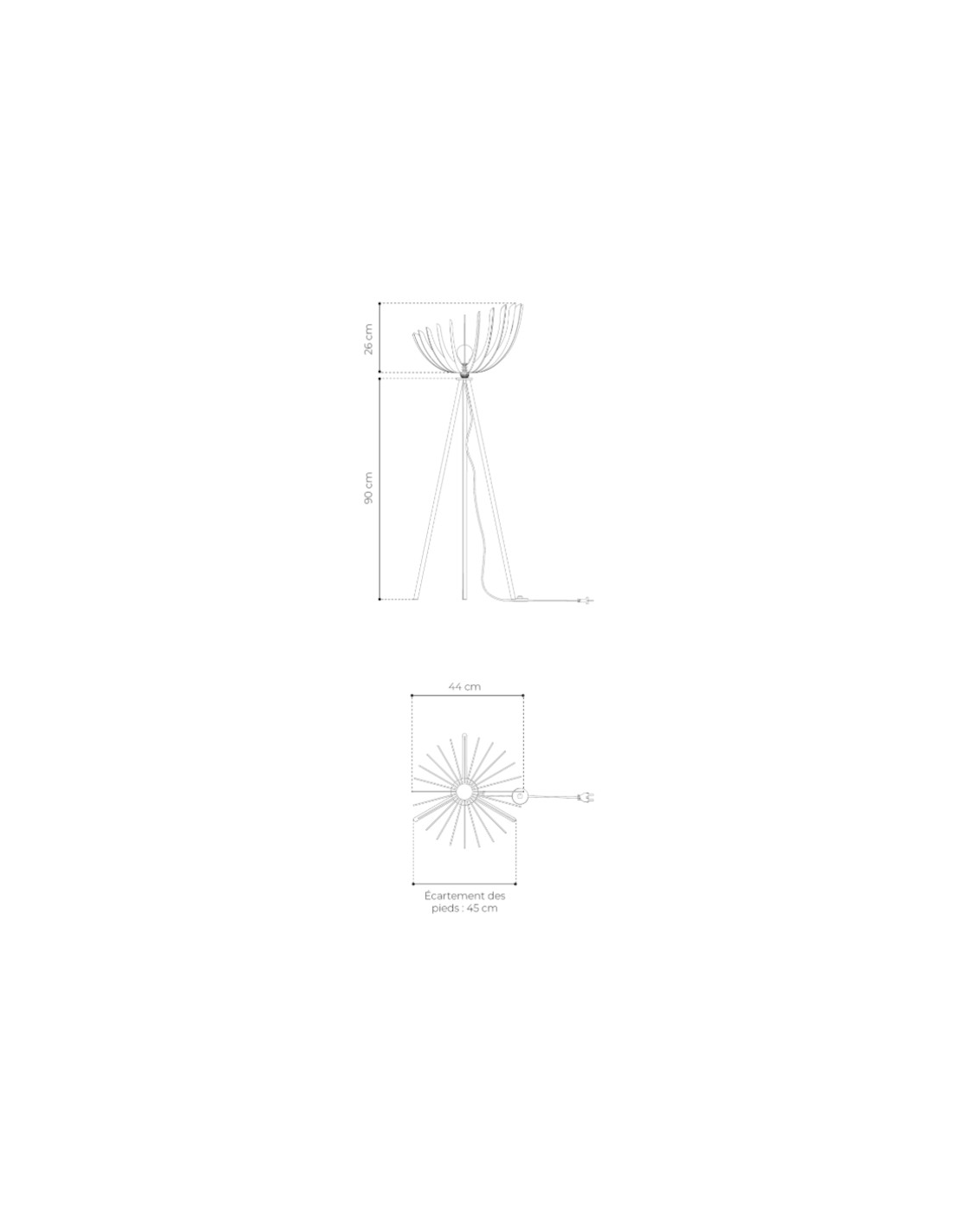 Dimension de la lampe : hauteur de 146 cm, diamètre de 44 cm, et le câble textile (100% coton) de 2.80 m avec interrupteur.