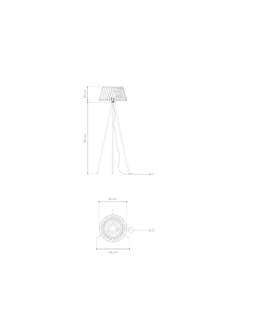 Dimension de la lampe : hauteur de 108 cm, diamètre de 35 cm, et le câble textile (100% coton) de 2.80 m avec interrupteur.