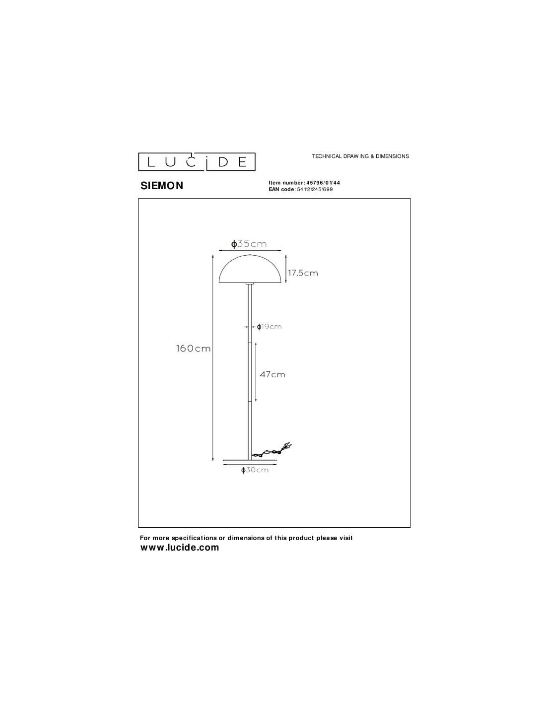 Avec ses dimensions de 35 cm de diamètre de 160 cm de hauteur, son câble de 200 cm et son indice de protection IP20, il est conçu pour une utilisation intérieur.