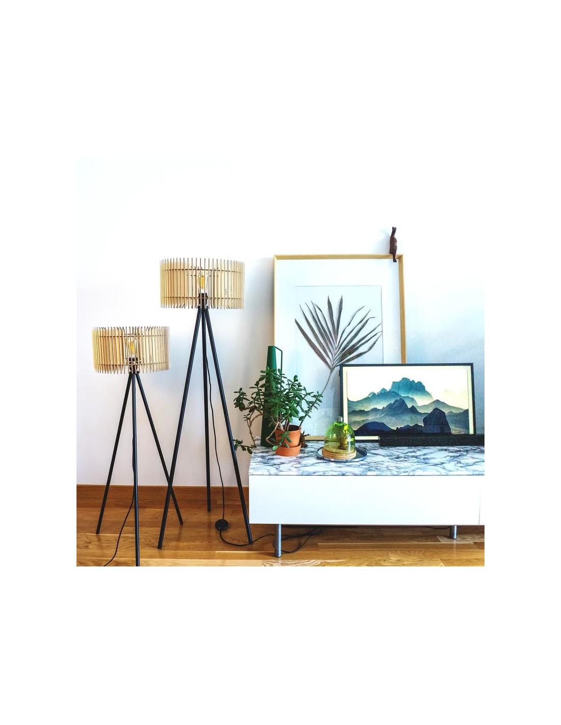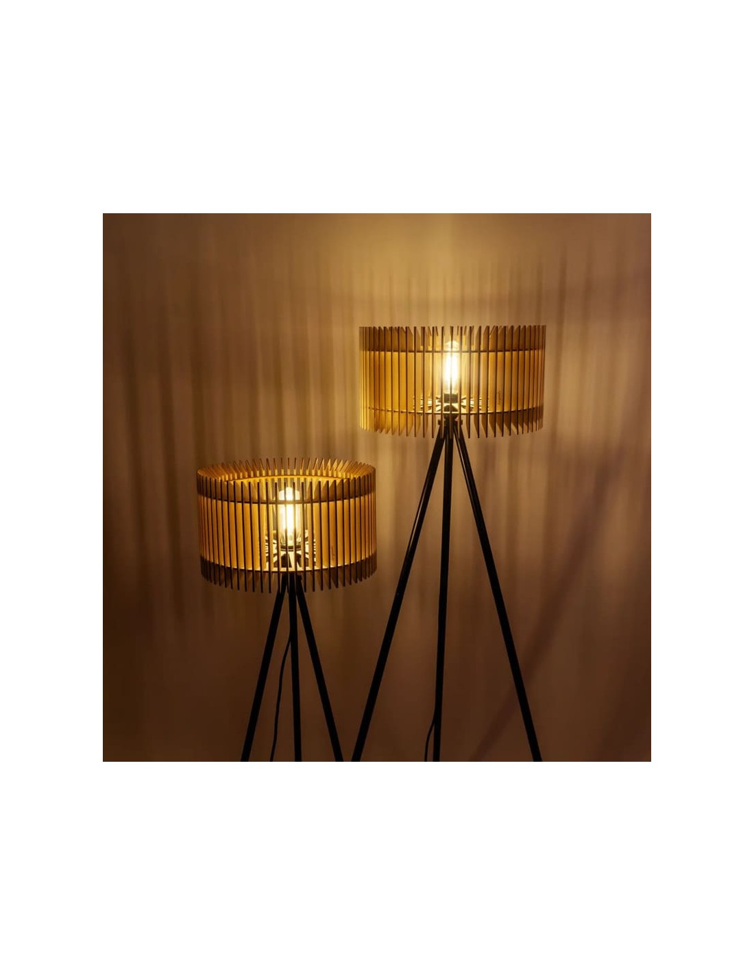 Fabriqués en bois de peuplier non traité issu de forêts durablement gérées, leurs abat-jours cylindriques en lamelles verticales diffusent une lumière douce et chaleureuse, tout en projetant des motifs graphiques sur les murs.