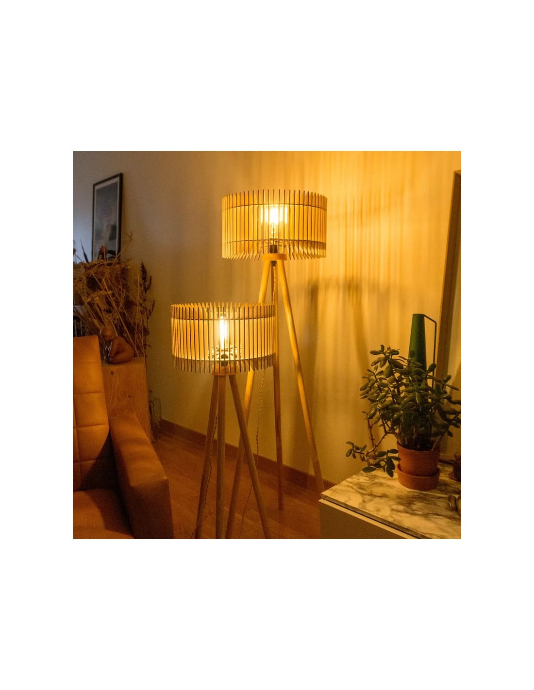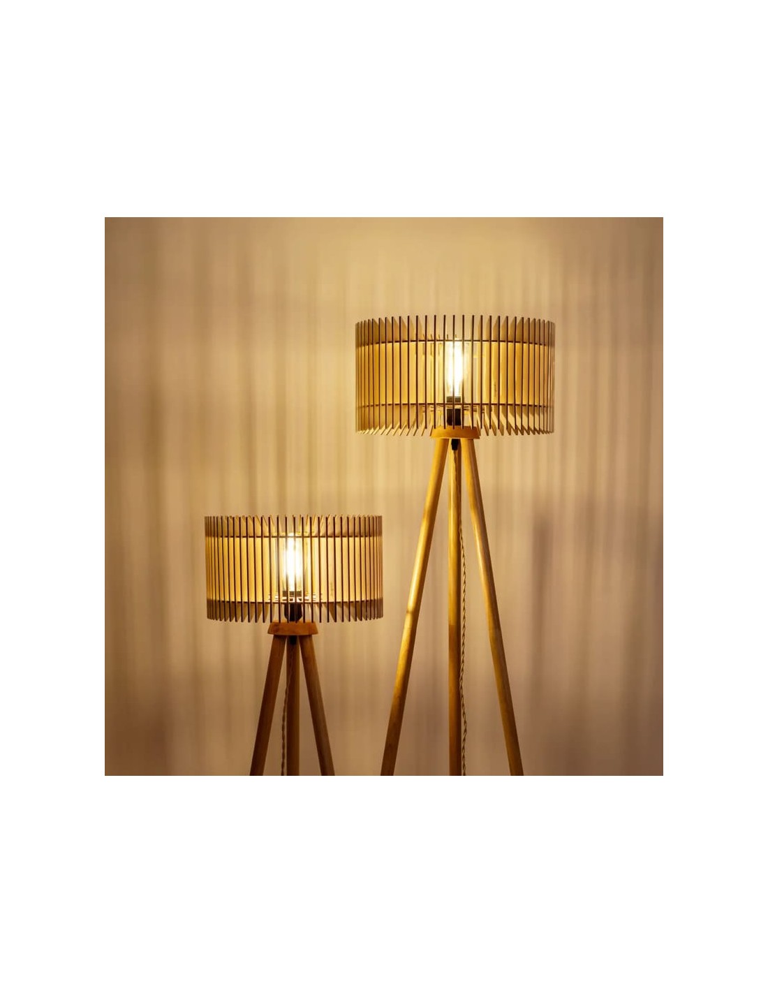 Chaque abat-jour est constitué de fines lamelles de bois formant une structure ajourée qui diffuse une lumière douce et chaleureuse.