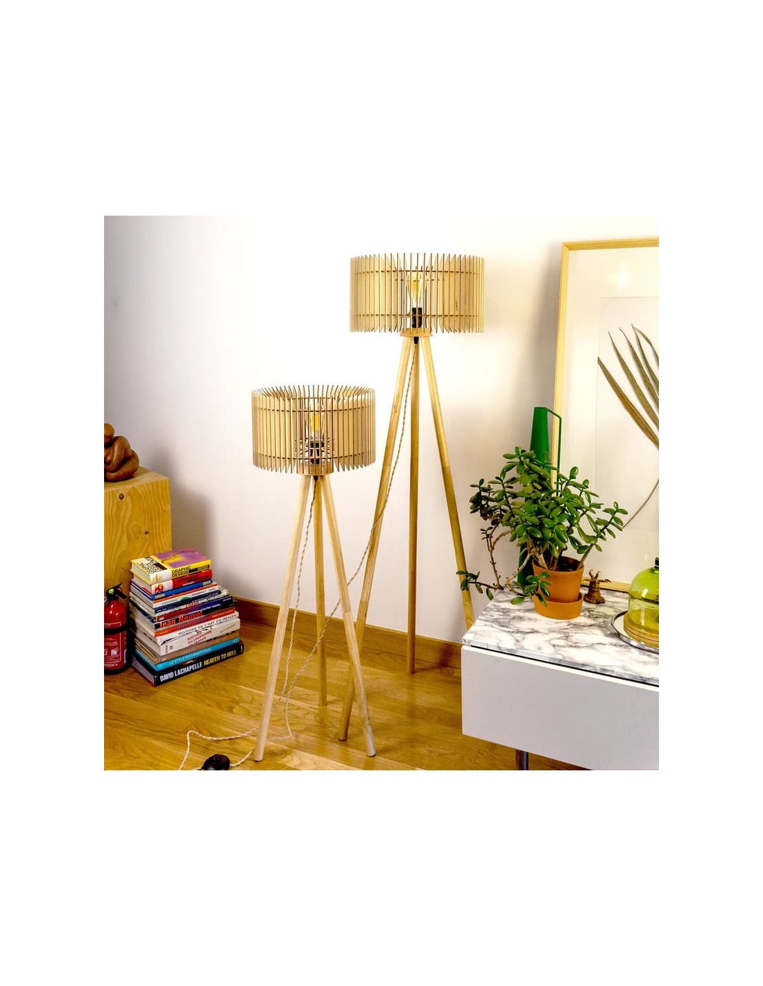 Le lampadaire Duo Agathe en bois se compose de deux luminaires sur trépied (un petit et un grand), fabriqués en peuplier issu de forêts gérées durablement, non traité et à faible émission de COV.