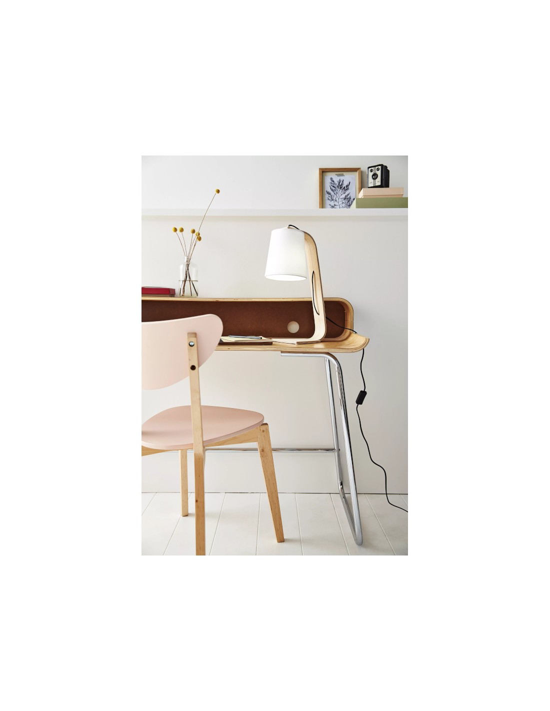 Cette lampe de bureau est en bois clair avec un abat-jour en tissu écru.