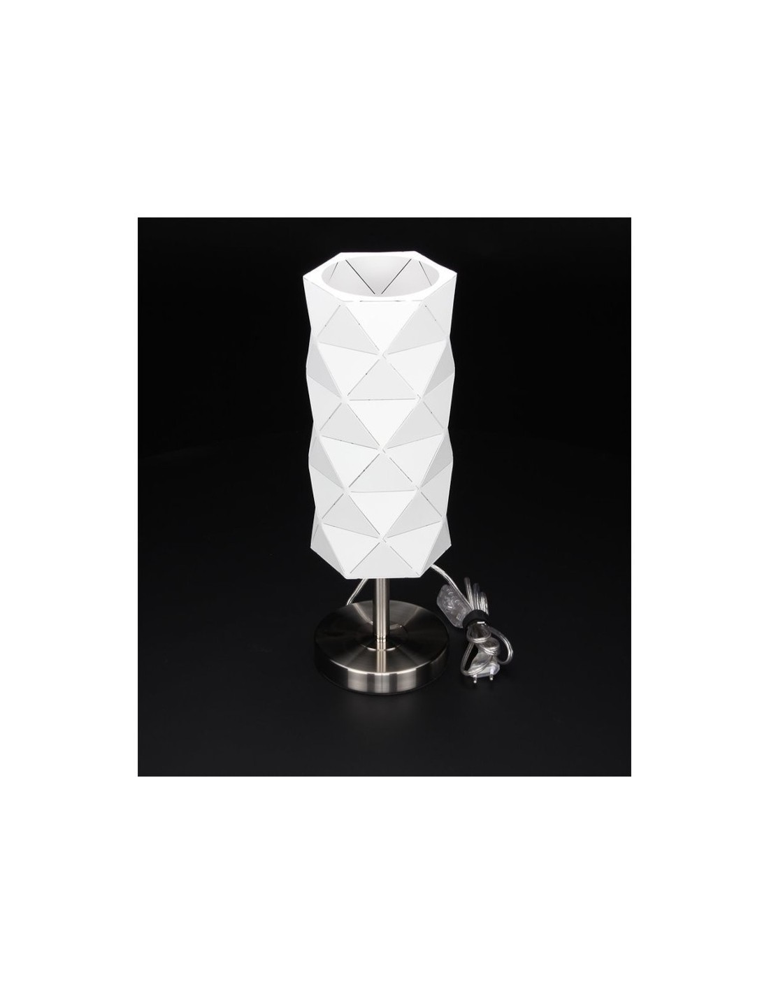 Cette lampe de table est en métal laqué blanc mat avec un pied en métal chromé satin.