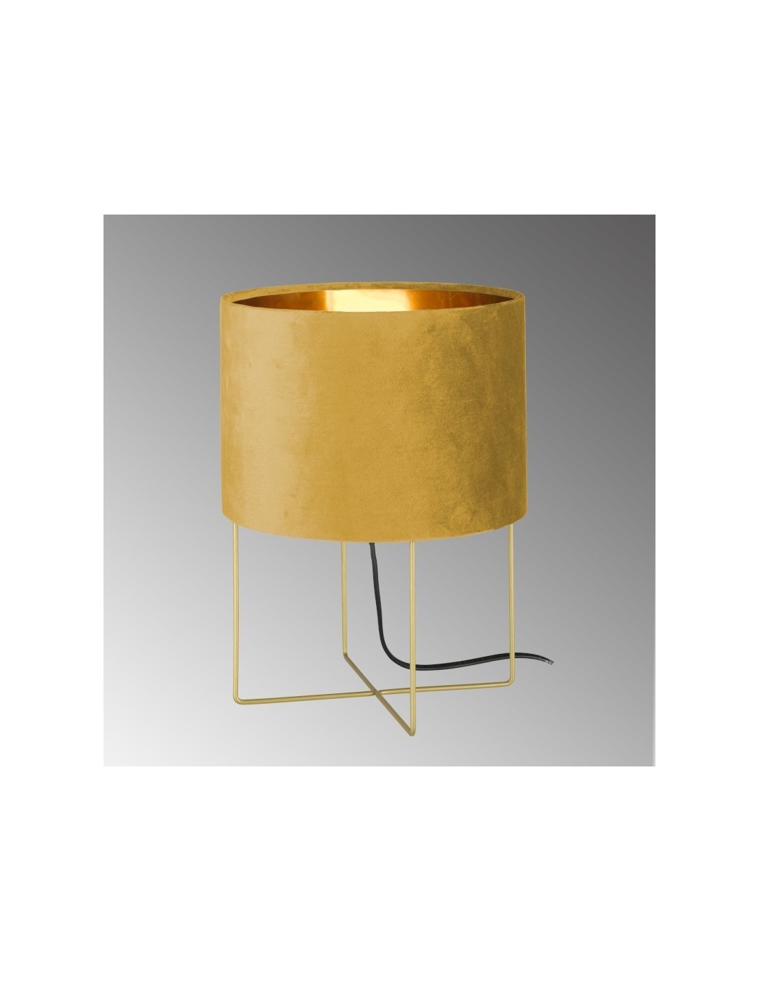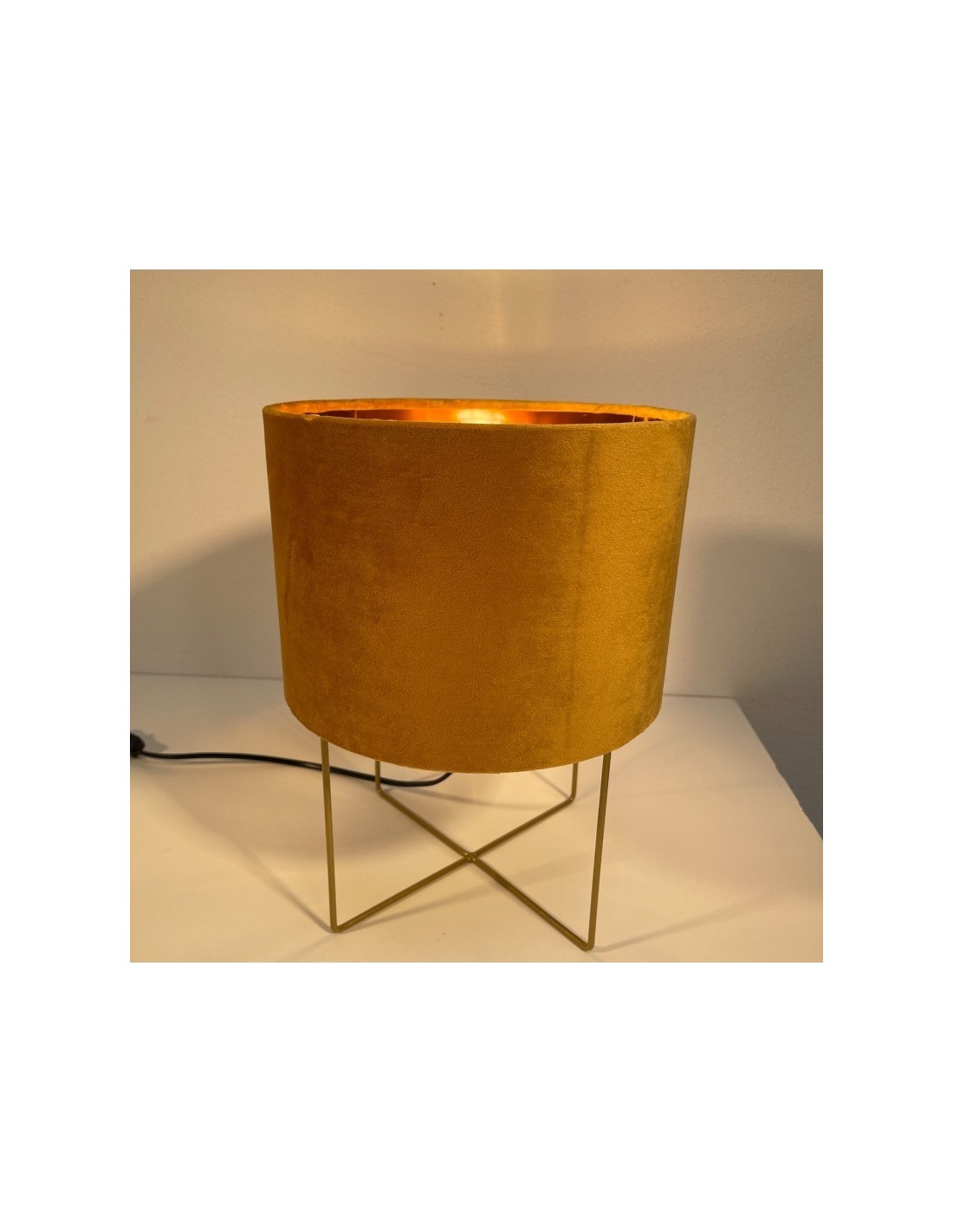 Cette lampe de table est en laiton doré avec un abat-jour en velours moutarde .