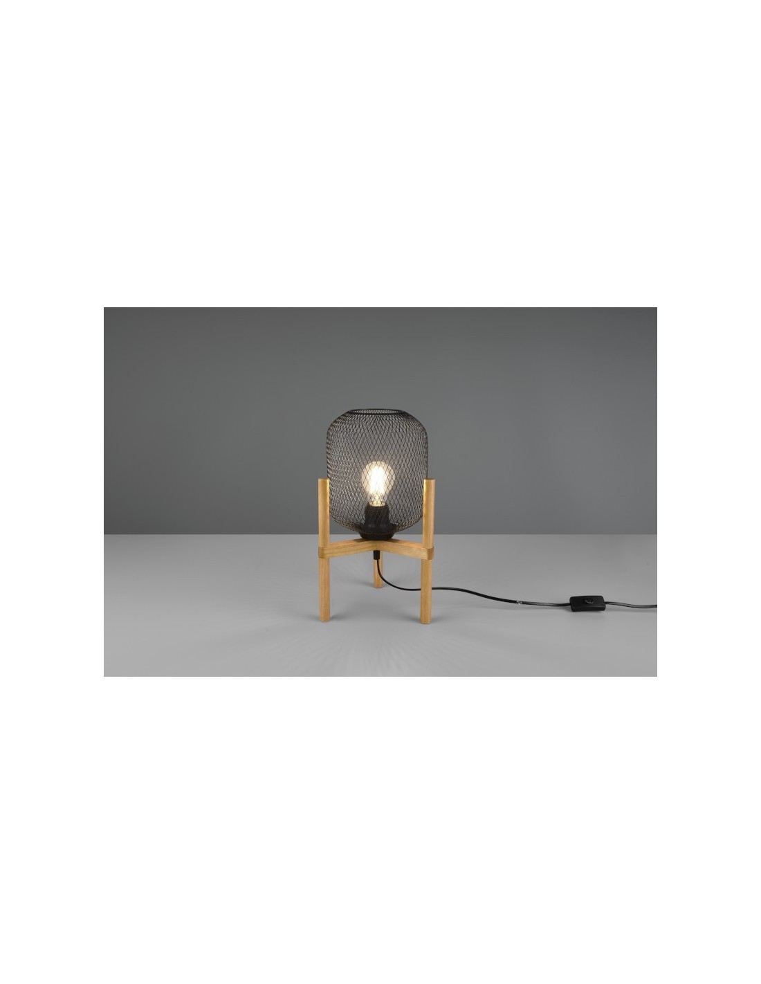 La lampe à poser Led Calimero est constituée d'un abat-jour en résille métallique noir et d'un piètement en bois.
