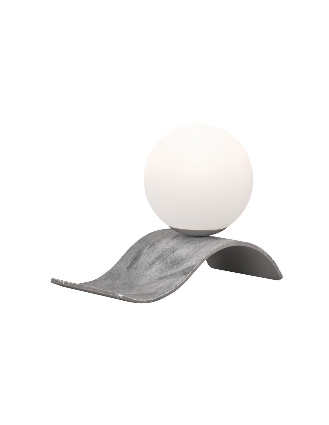 Elle est constituée d'une base en métal gris ancien sur laquelle est posée une sphére en verre opalin.