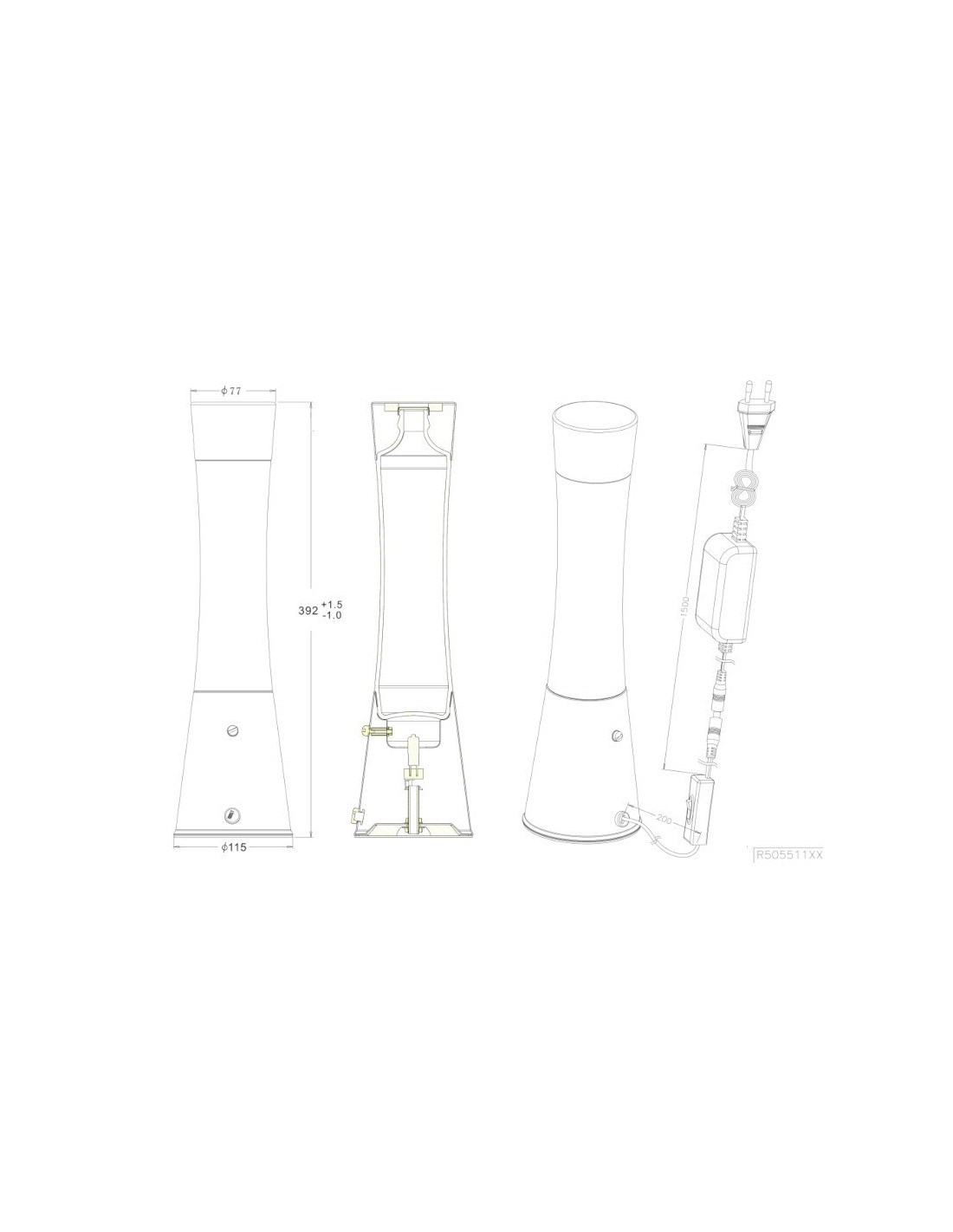 Elle est constituée d'un pied et d'un dessus en métal couleur chrome pour les version lave rouge ou verte et cuivre pour la version lave blanche et d'un tube en verre transparent.