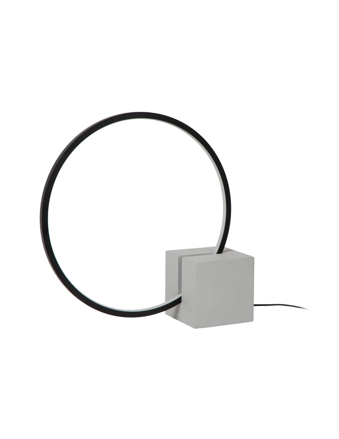 La lampe circulaire — tout est dans le nom — s'amuse avec un socle carré en béton gris.