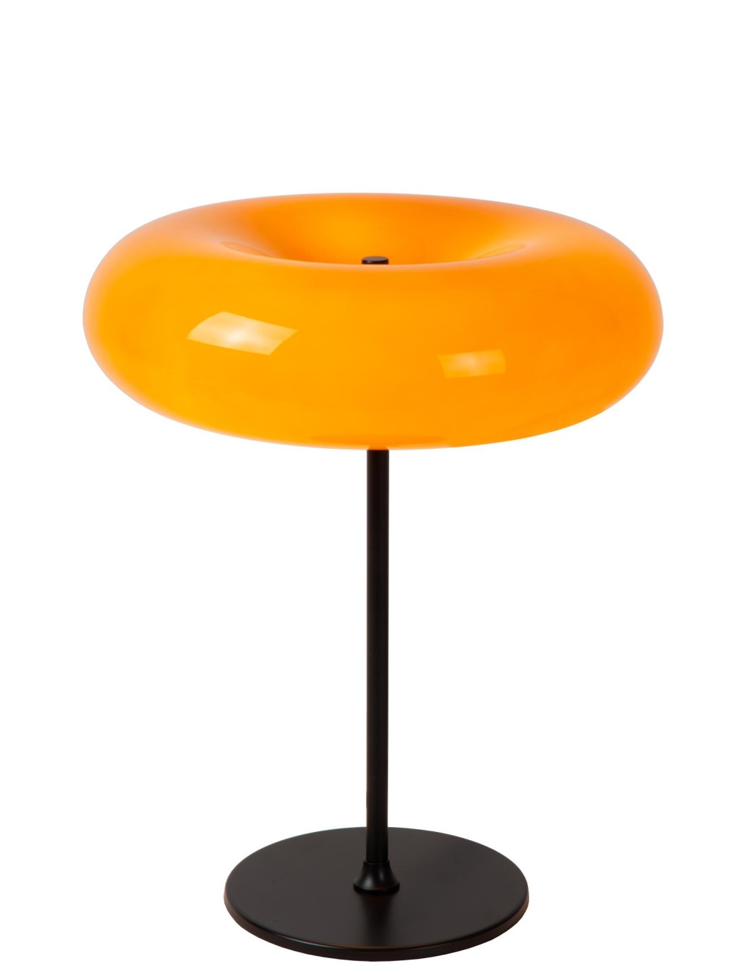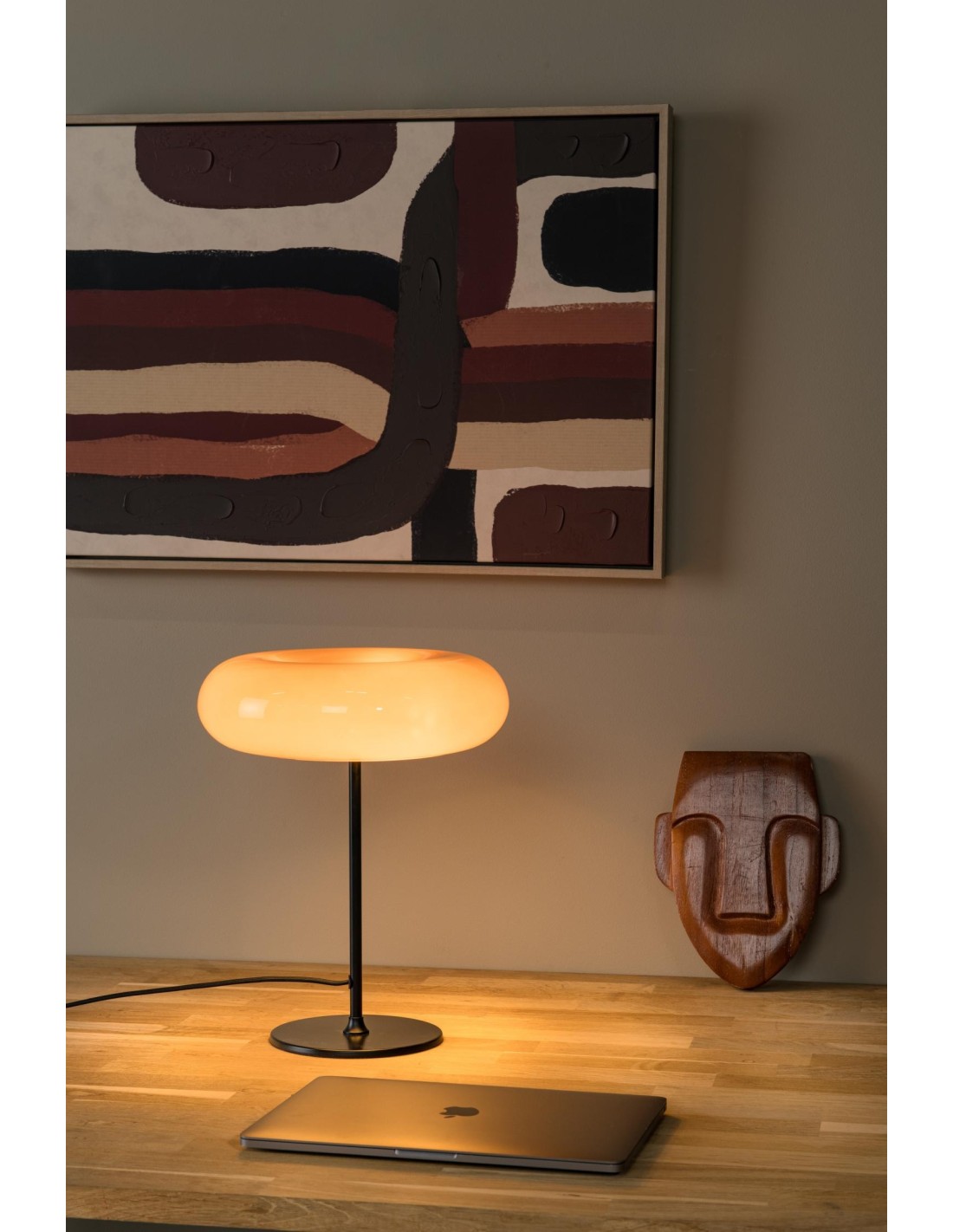 Cette lampe de table est composée d'un donut en verre laqué brillant, reposant sur un socle et un pied métalliques élancés.