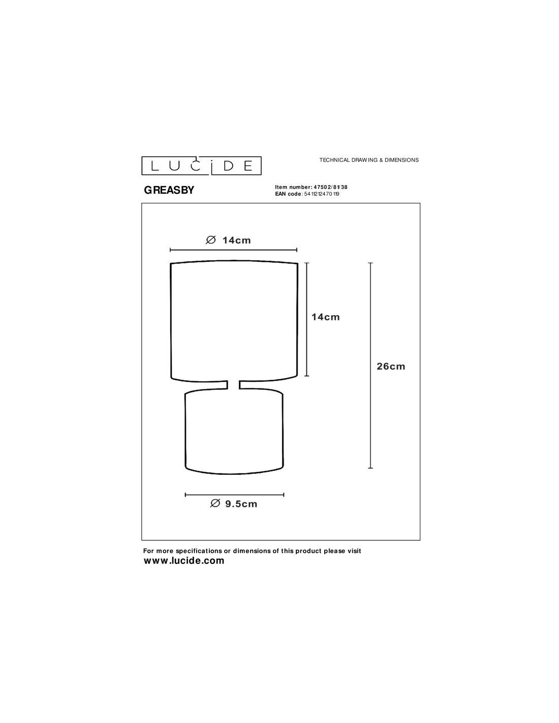 Avec une hauteur de 26 cm, un diamètre de 14 cm et un câble de 130 cm dotée d'un interrupteur marche /arrêt intégré, cette lampe de table est facile à installer et à utiliser dans une chambre, un salon ou une console.