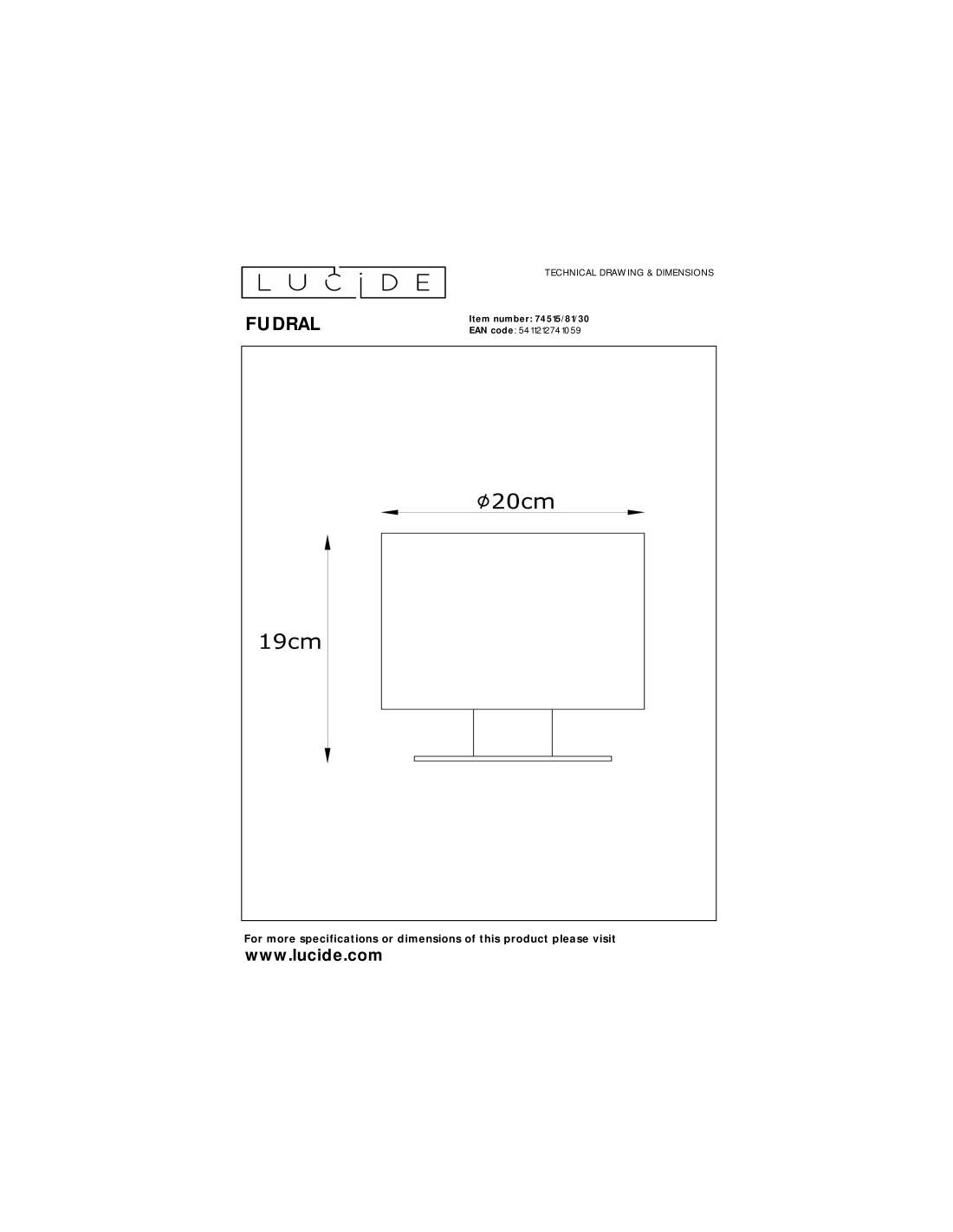 Fudral s'adapte parfaitement à une table basse, à une bibliothèque ouverte ou à la table de chevet. Elle peut également être posée sur une commode dans un couloir. Fudral est intemporelle avec une touche de modernité. La lampe de table mesure 19 centimètres de haut et 20 centimètres de diamètre.