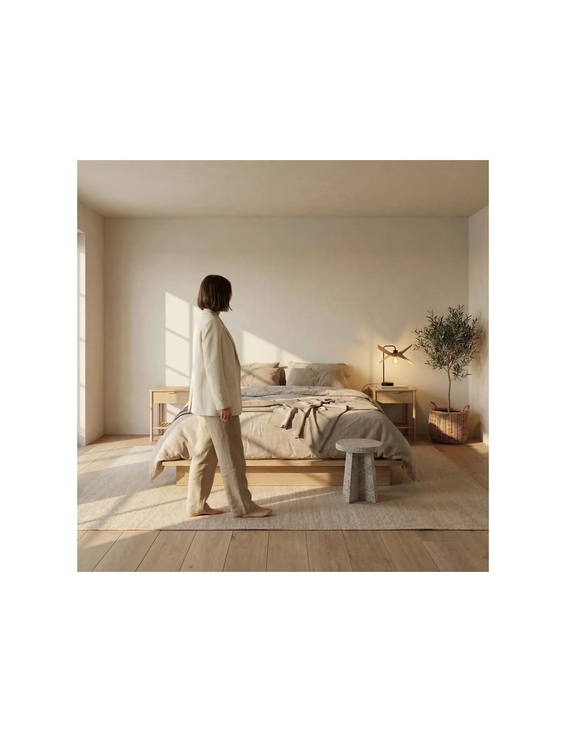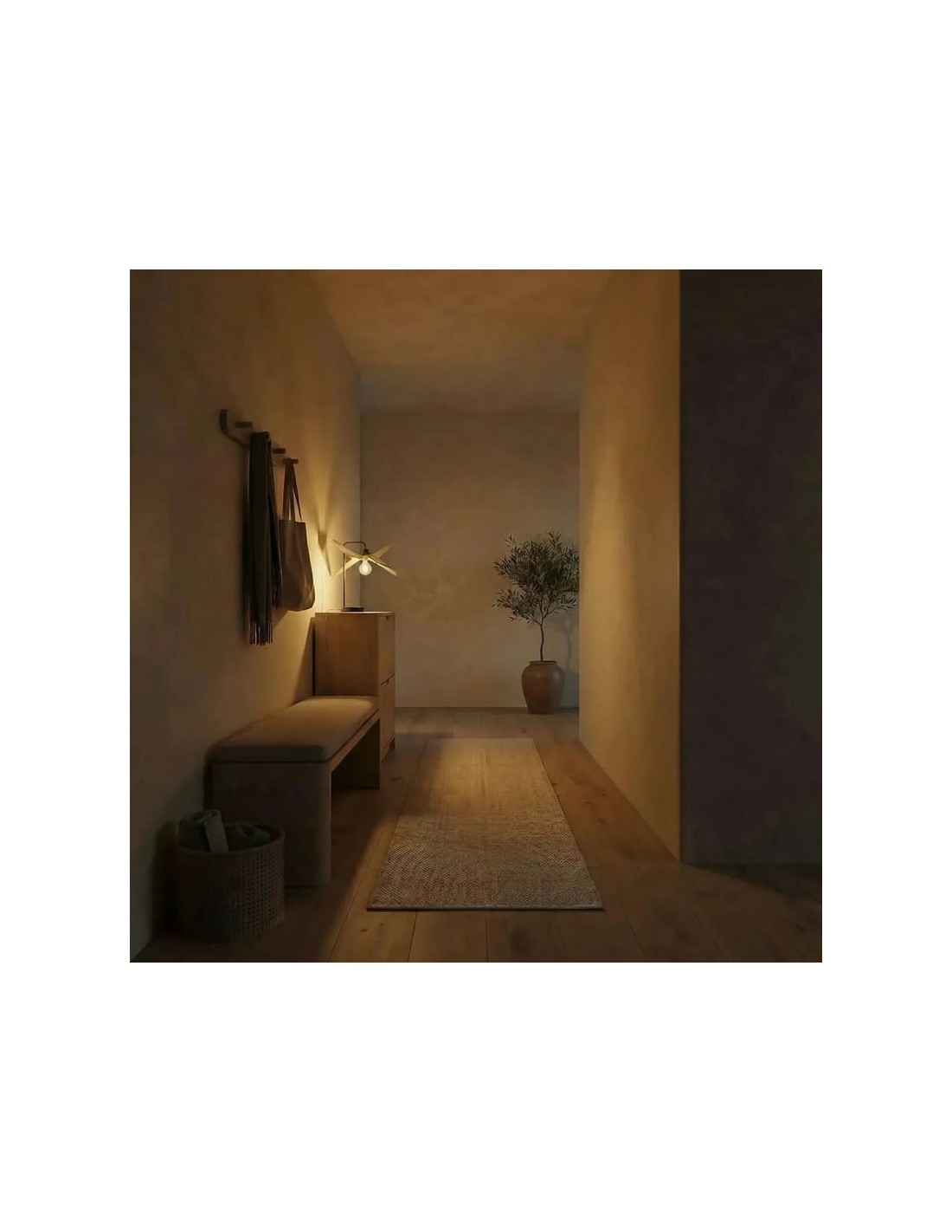 Sa structure en lamelles de bois non traité assure une diffusion homogène et douce de la lumière tout en créant un jeux d'ombres décoratif.