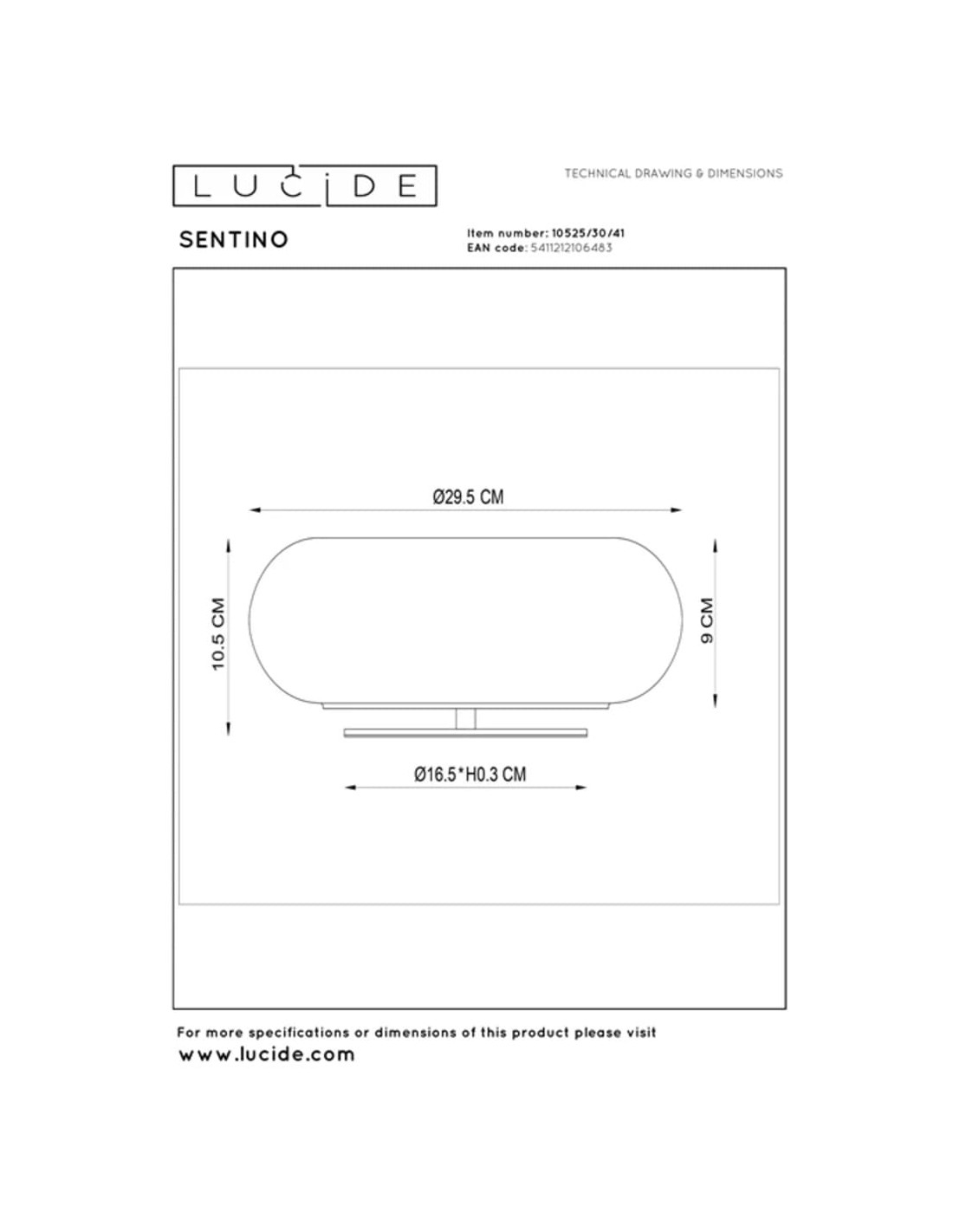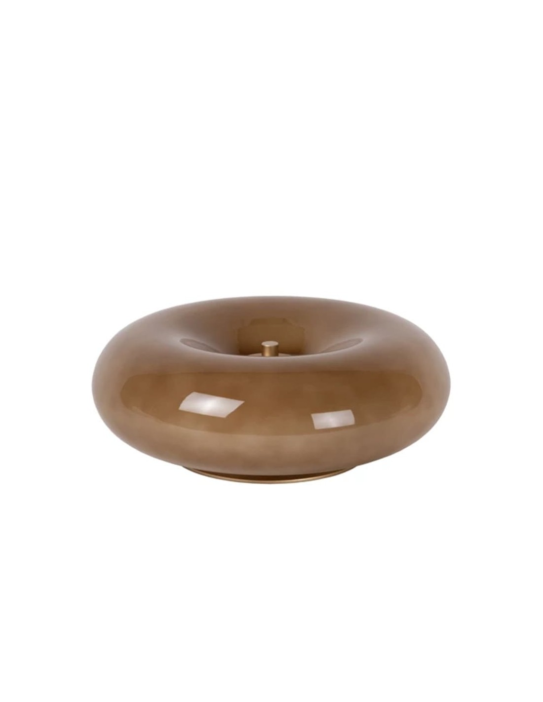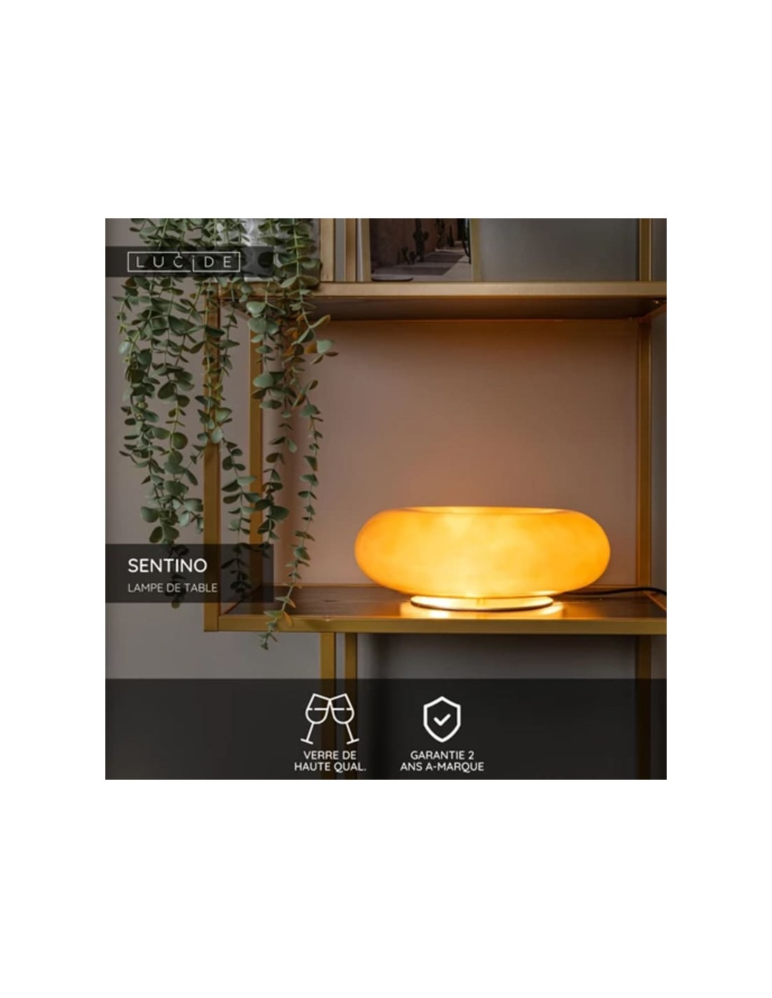 La lampe de table Sentino de la marque Lucide en coloris taupe est un luminaire d'intérieur au design rétro caractérisé par sa forme ronde en verre laqué brillant montée sur une base métallique.