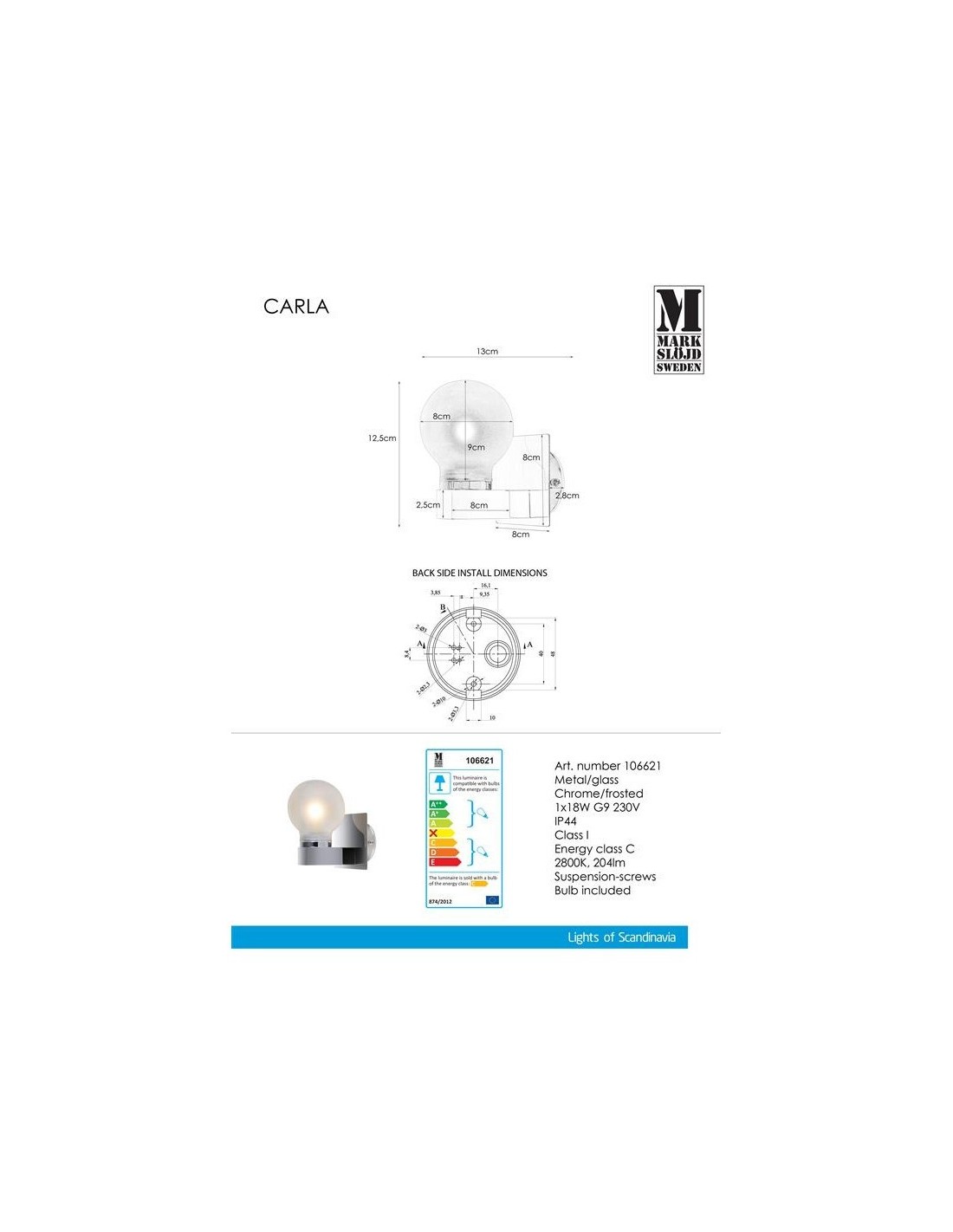 L'applique murale intérieure Carla possède un indice de protection (IP44) qui autorise son installation dans une pièce humide (salle de bain, buanderie).