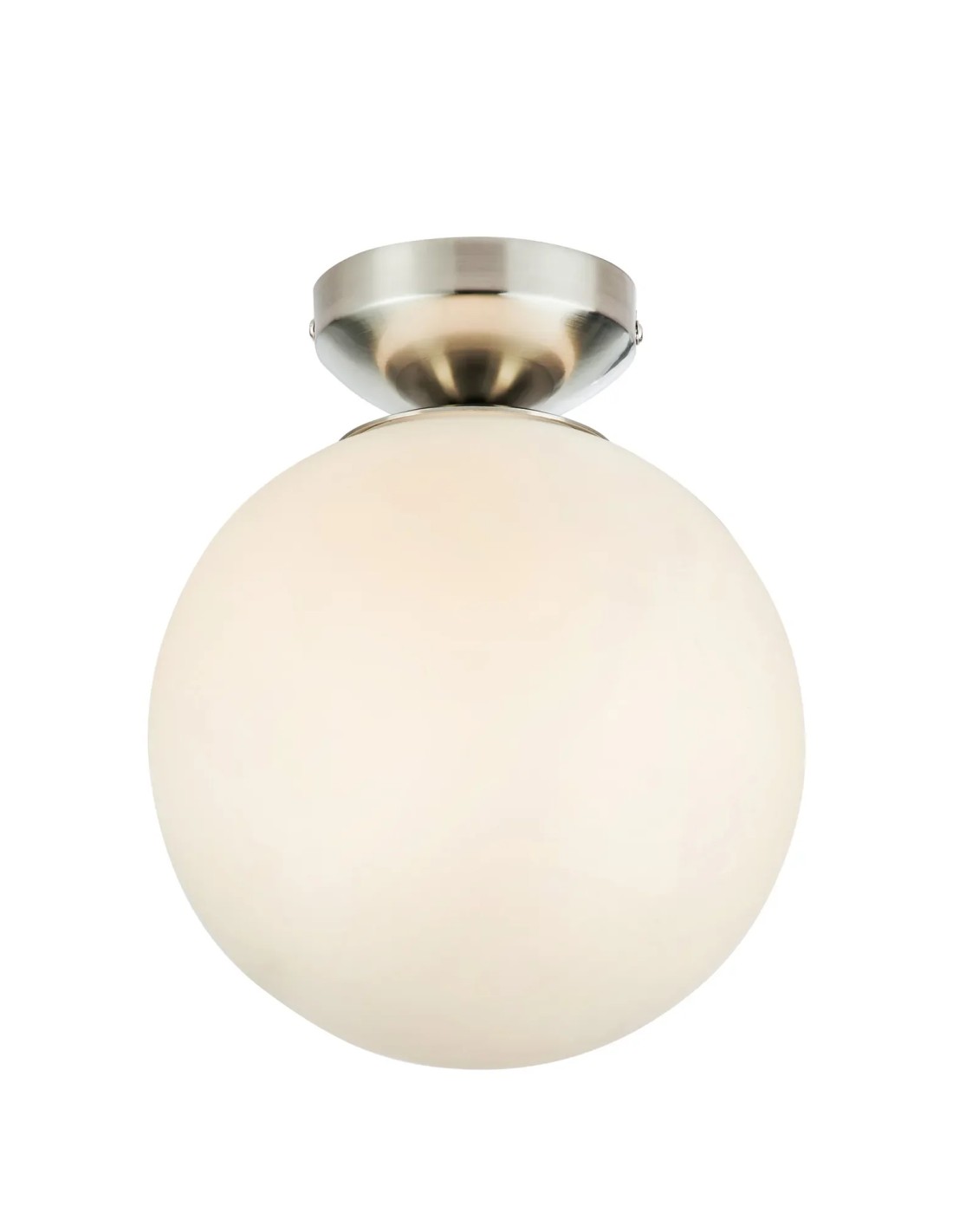 Le plafonnier Stintino de la marque Markslojd associe une base en acier chromé à un abat-jour en verre blanc pour un rendu sobre et élégant.