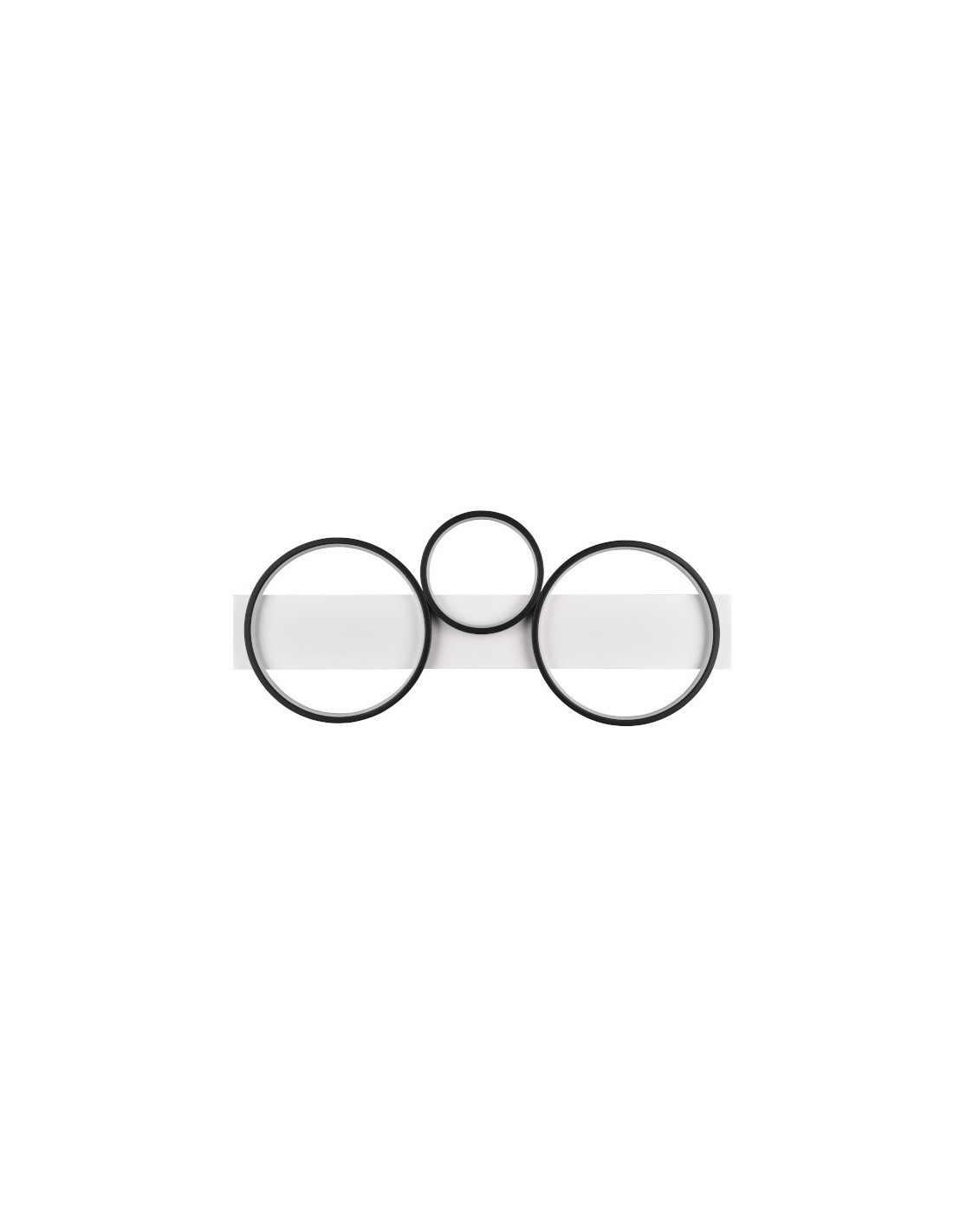 Il est constitué de 3 ronds métalliques noirs en quinconce fixés sur un rectangle en bois blanc.