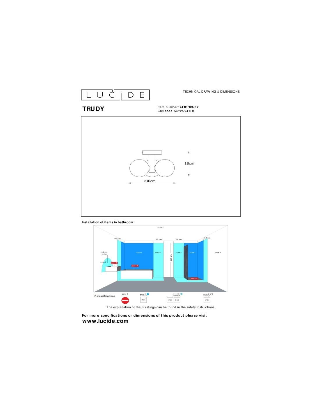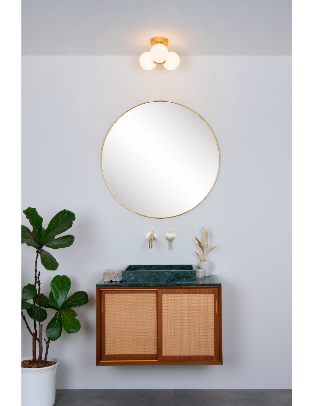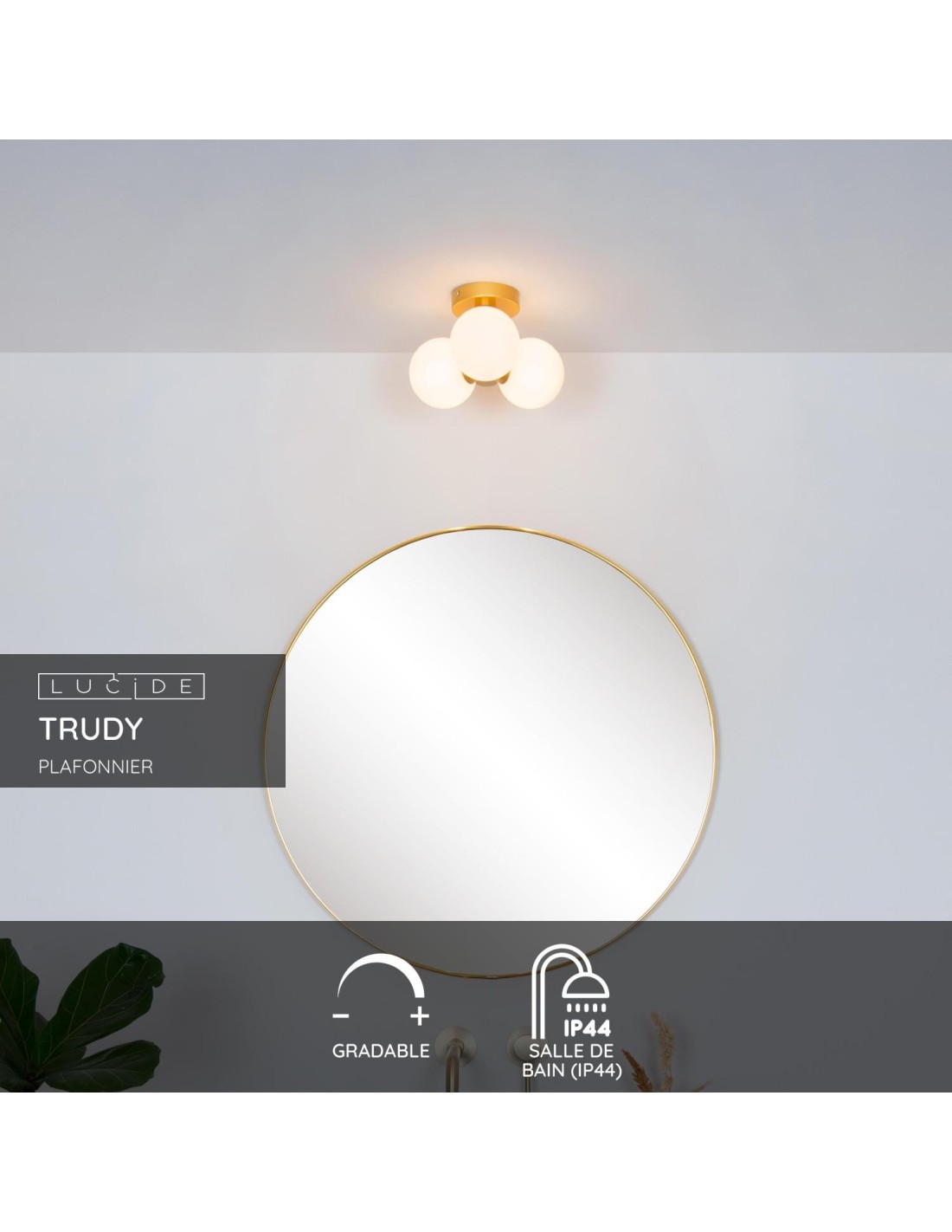 Le plafonnier TRUDY de la marque Lucide en finition or mat et laiton est un luminaire design et fonctionnel spécialement conçu pour l'intérieur, y compris les espaces humides comme la salle de bains grâce à sa classe de protection IP44.