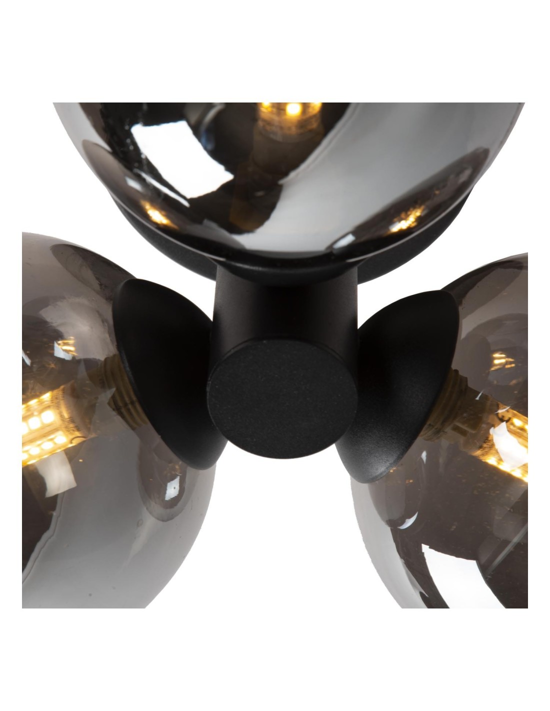 Sa teinte noire associée à des abat-jours en verre fumé crée un contraste raffiné qui attire le regard tout en restant discret, apportant une touche de sophistication à la pièce; ce mariage de matériaux met en valeur la pureté des formes rondes des globes en verre.