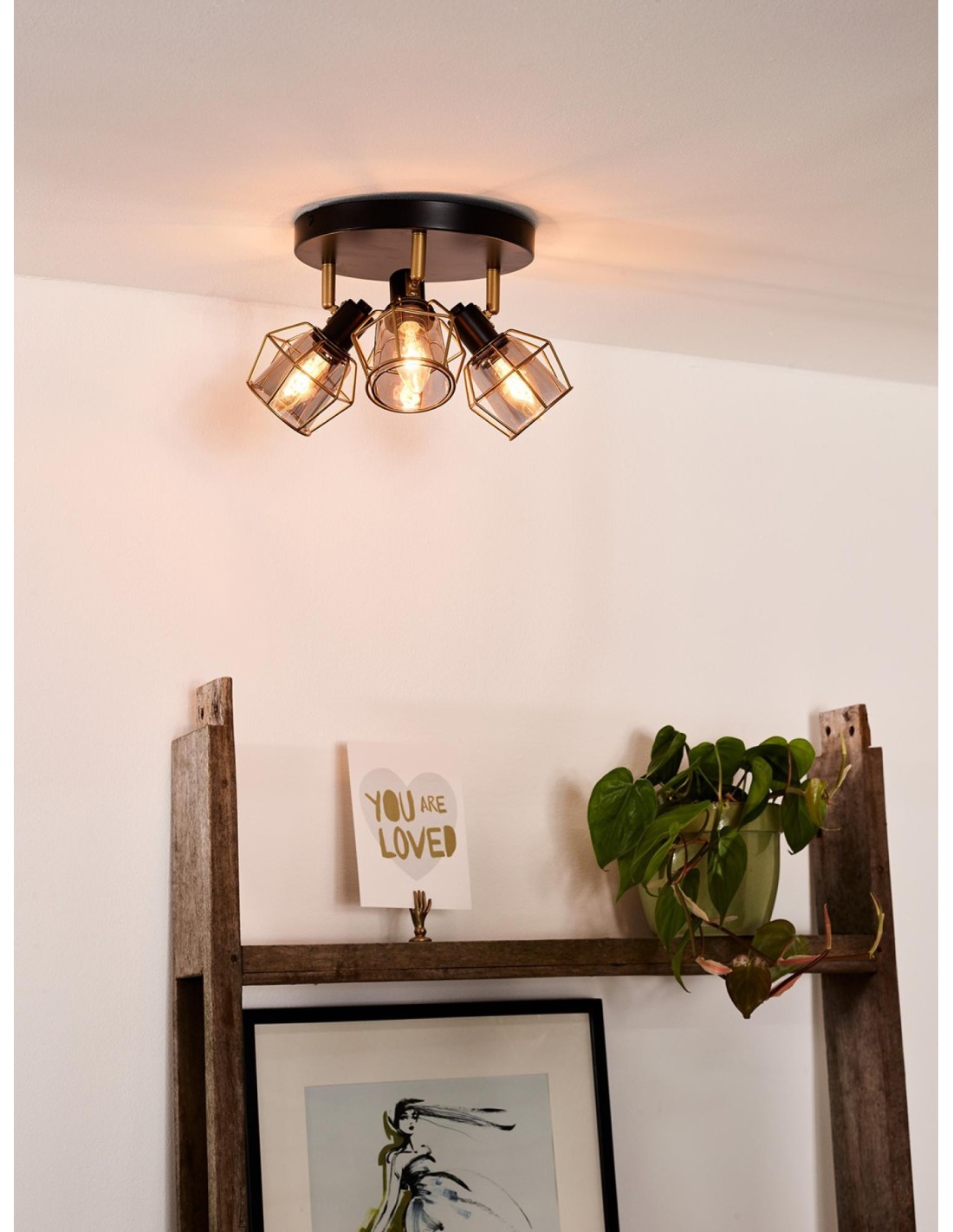 Le plafonnier NILA de la marque Lucide séduit par son style vintage et moderne à la fois, associant une structure en métal noir à des abat- jours en verre fumé.