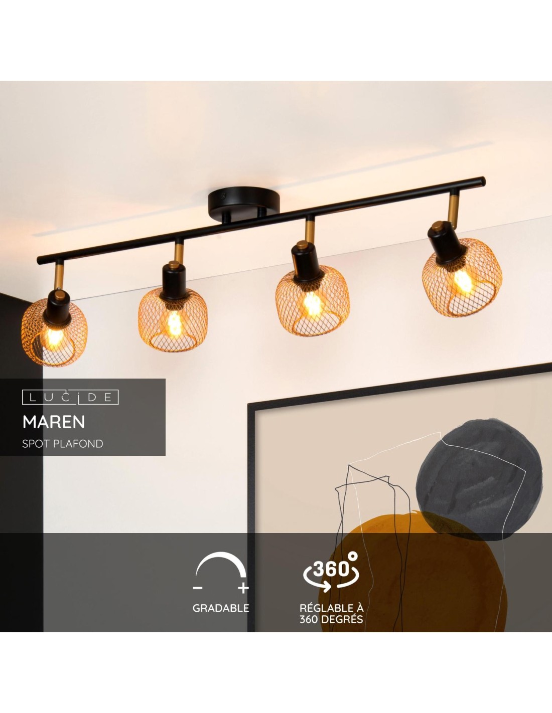 Ses quatre spots orientables ajoutent du dynamisme visuel tout en permettant de jouer avec la lumière pour sublimer la pièce.
